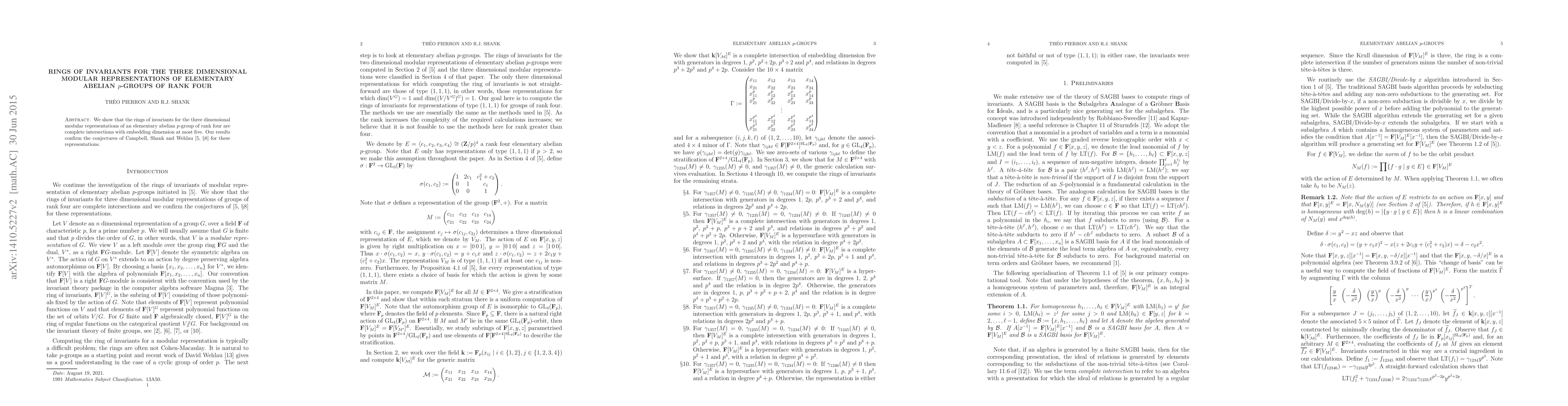 Summary: The paper demonstrates that the rings of invariants for three-dimensional modular representations of elementary abelian $p$-groups of rank four are complete intersections with an embedding dimension not exceeding five, thereby validating the conjectures of Campbell, Shank, and Wehlau.