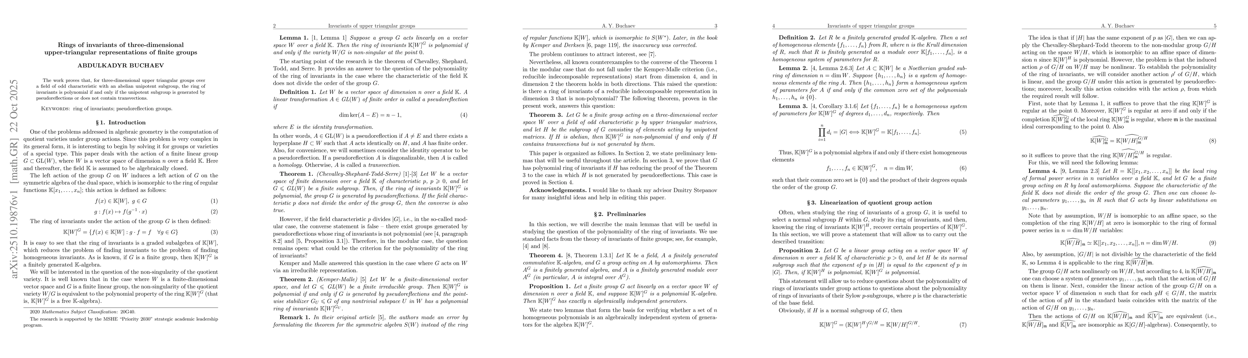The work proves that, for three-dimensional upper triangular groups over a field of odd characteristic with an abelian unipotent subgroup, the ring of invariants is polynomial if and only if the unipotent subgroup is generated by pseudoreflections or does not contain transvections.