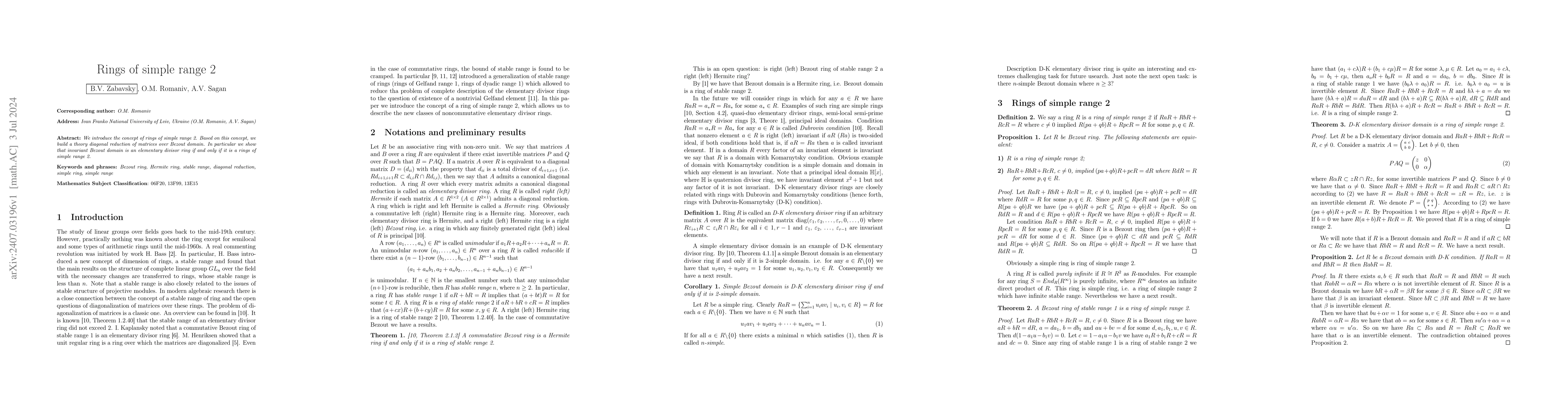 Summary: This paper introduces the concept of rings of simple range 2 and develops a theory for the diagonal reduction of matrices over Bezout domains, demonstrating that an invariant Bezout domain is an elementary divisor ring if and only if it is a ring of simple range 2.