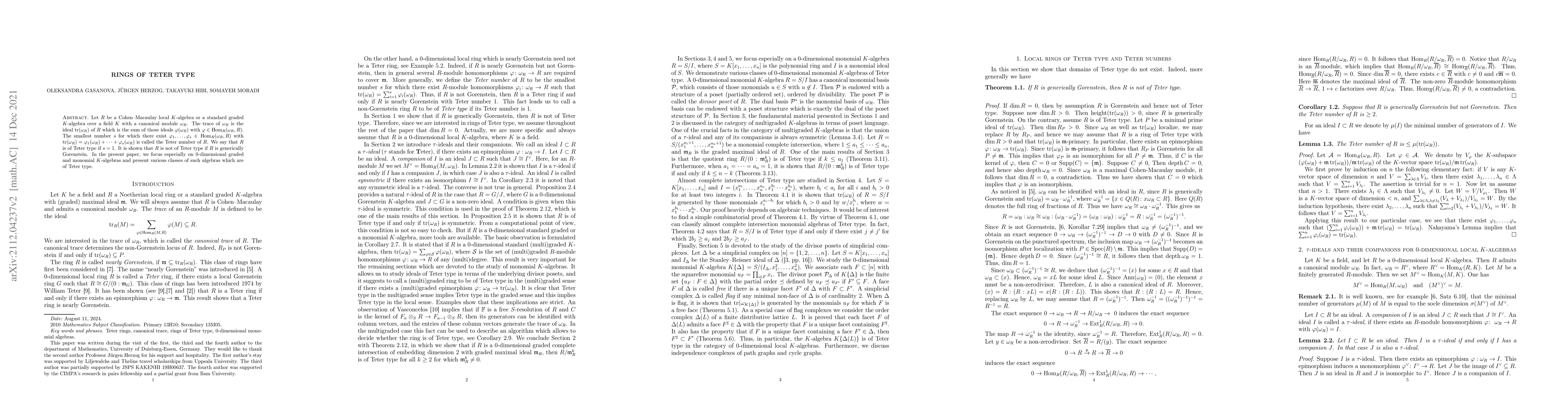 Let $R$ be a Cohen--Macaulay local $K$-algebra or a standard graded $K$-algebra over a field $K$ with a canonical module $\omega_R$. The trace of $\omega_R$ is the ideal $tr(\omega_R)$ of $R$ which is the sum of those ideals $\varphi(\omega_R)$ with $\varphi\in Hom_R(\omega_R,R)$. The smallest number $s$ for which there exist $\varphi_1, \ldots, \varphi_s \in Hom_R(\omega_R,R)$ with $tr(\omega_R)=\varphi_1(\omega_R) + \cdots + \varphi_s(\omega_R)$ is called the Teter number of $R$. We say that $R$ is of Teter type if $s = 1$. It is shown that $R$ is not of Teter type if $R$ is generically Gorenstein. In the present paper, we focus especially on $0$-dimensional graded and monomial $K$-algebras and present various classes of such algebras which are of Teter type.