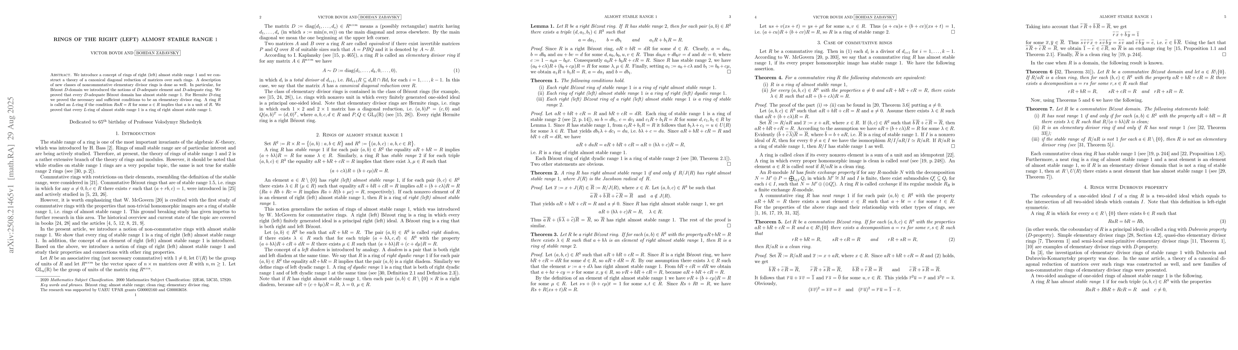 We introduce a concept of rings of right (left) almost stable range $1$ and we construct a theory of a canonical diagonal reduction of matrices over such rings. A description of new classes of noncommutative elementary divisor rings is done as well. In particular, for B\'ezout $D$-domain we introduced the notions of $D$-adequate element and $D$-adequate ring. We proved that every $D$-adequate B\'ezout domain has almost stable range $1$. For Hermite $D$-ring we proved the necessary and sufficient conditions to be an elementary divisor ring. A ring $R$ is called an $L$-ring if the condition $RaR = R$ for some $a\in R$ implies that $a$ is a unit of $R$. We proved that every $L$-ring of almost stable range $1$ is a ring of right almost stable range $1$.