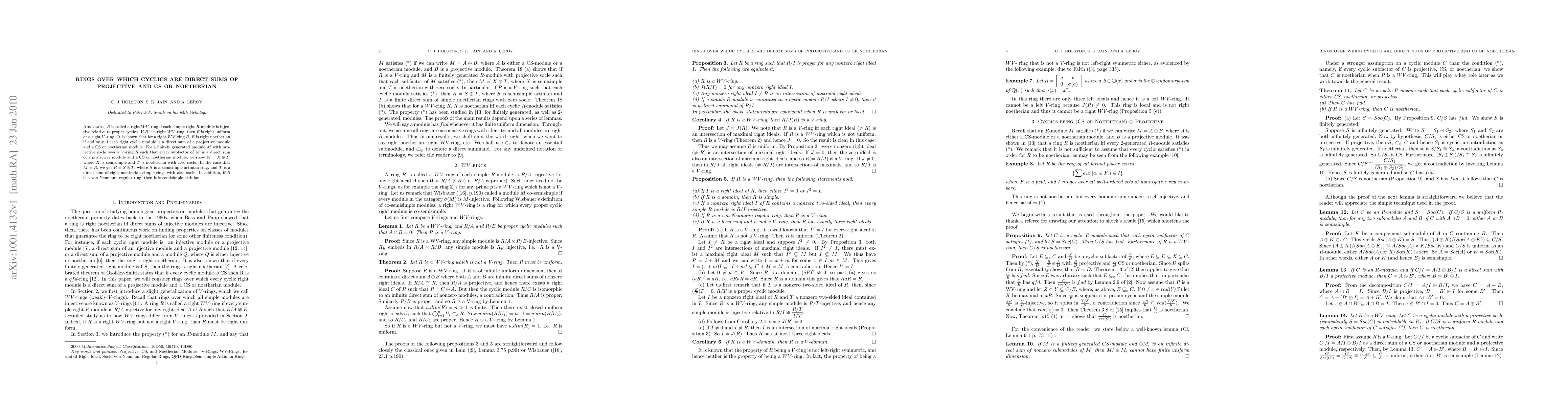 R is called a right WV -ring if each simple right R-module is injective relative to proper cyclics. If R is a right WV -ring, then R is right uniform or a right V -ring. It is shown that for a right WV-ring R, R is right noetherian if and only if each right cyclic module is a direct sum of a projective module and a CS or noetherian module. For a finitely generated module M with projective socle over a V -ring R such that every subfactor of M is a direct sum of a projective module and a CS or noetherian module, we show M = X \oplus T, where X is semisimple and T is noetherian with zero socle. In the case that M = R, we get R = S \oplus T, where S is a semisimple artinian ring, and T is a direct sum of right noetherian simple rings with zero socle. In addition, if R is a von Neumann regular ring, then it is semisimple artinian.