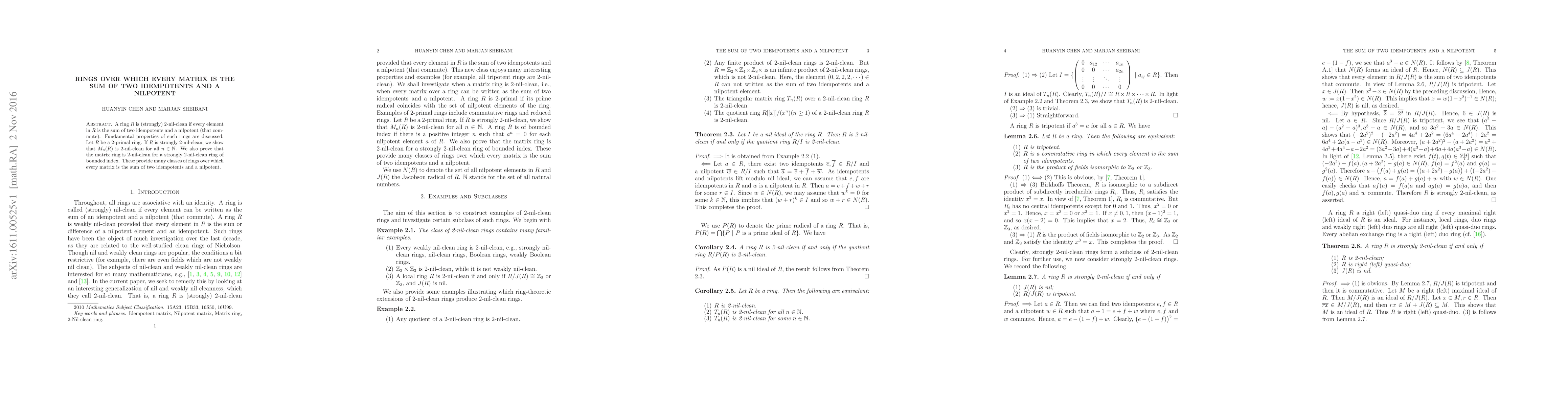 Summary: This paper explores rings where every element can be expressed as the sum of two idempotents and a nilpotent (2-nil-clean rings). It demonstrates that such rings, when 2-primal, maintain this property in their matrix rings for all dimensions, providing numerous examples of these special ring classes.