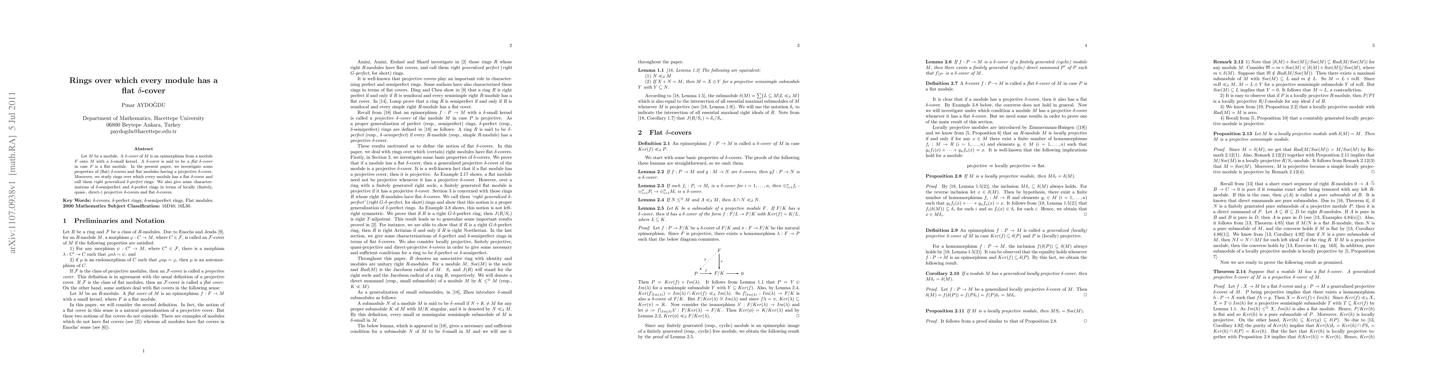 Let $M$ be a module. A {\em $\delta$-cover} of $M$ is an epimorphism from a module $F$ onto $M$ with a $\delta$-small kernel. A $\delta$-cover is said to be a {\em flat $\delta$-cover} in case $F$ is a flat module. In the present paper, we investigate some properties of (flat) $\delta$-covers and flat modules having a projective $\delta$-cover. Moreover, we study rings over which every module has a flat $\delta$-cover and call them {\em right generalized $\delta$-perfect} rings. We also give some characterizations of $\delta$-semiperfect and $\delta$-perfect rings in terms of locally (finitely, quasi-, direct-) projective $\delta$-covers and flat $\delta$-covers.