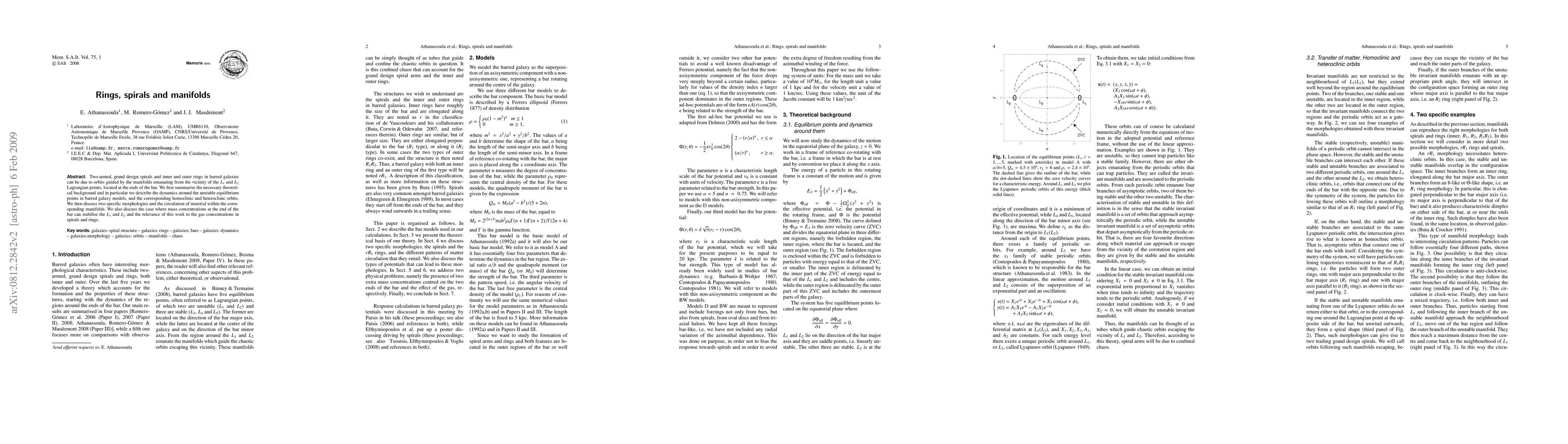 This paper explores the dynamics of barred galaxies, focusing on how spirals and rings form due to orbits influenced by manifolds near the L1 and L2 Lagrangian points. It discusses the theoretical background of these dynamics and the circulation of material within the associated manifolds, highlighting the stabilization effects of mass concentrations at the ends of the bar.