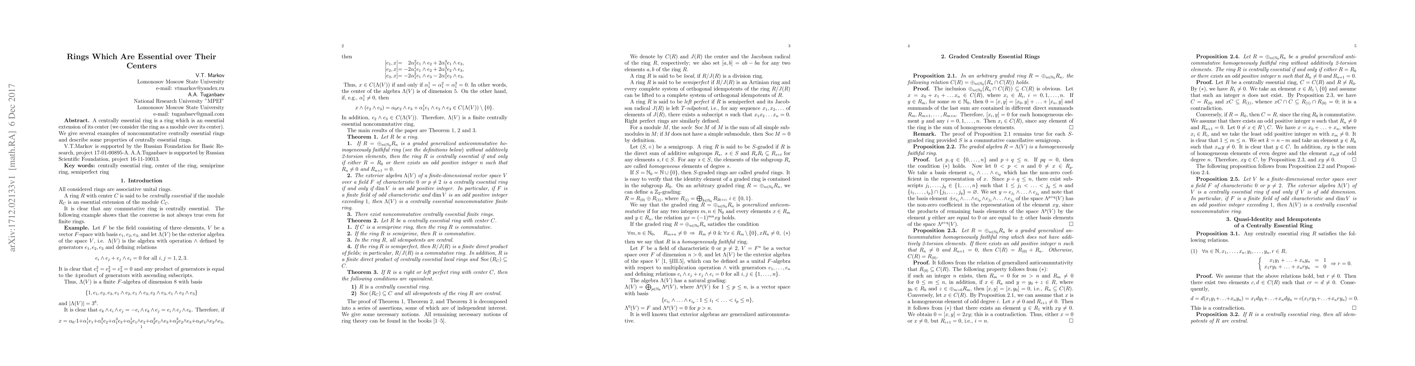 A centrally essential ring is a ring which is an essential extension of its center (we consider the ring as a module over its center). We give several examples of noncommutative centrally essential rings and describe some properties of centrally essential rings. V.T.Markov is supported by the Russian Foundation for Basic Research, project 17-01-00895-A. A.A.Tuganbaev is supported by Russian Scientific Foundation, project 16-11-10013.