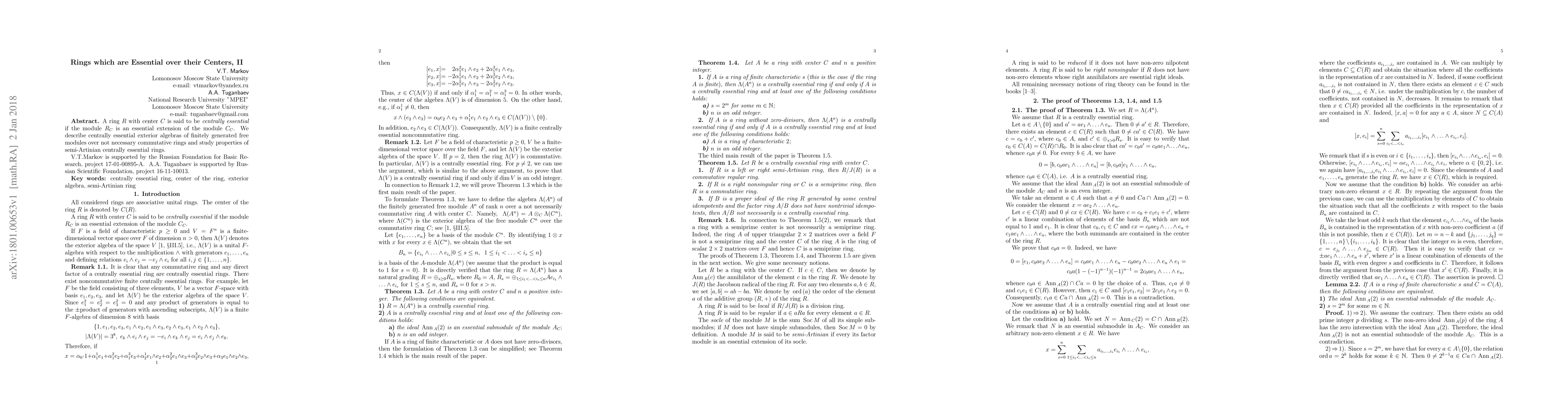 A ring $R$ with center $C$ is said to be\textit{centrally essential} if the module $R_C$ is an essential extension of the module $C_C$. We describe centrally essential exterior algebras of finitely generated free modules over not necessary commutative rings and study properties of semi-Artinian centrally essential rings. V.T.Markov is supported by the Russian Foundation for Basic Research, project 17-01-00895-A.~ A.A. Tuganbaev is supported by Russian Scientific Foundation, project 16-11-10013.