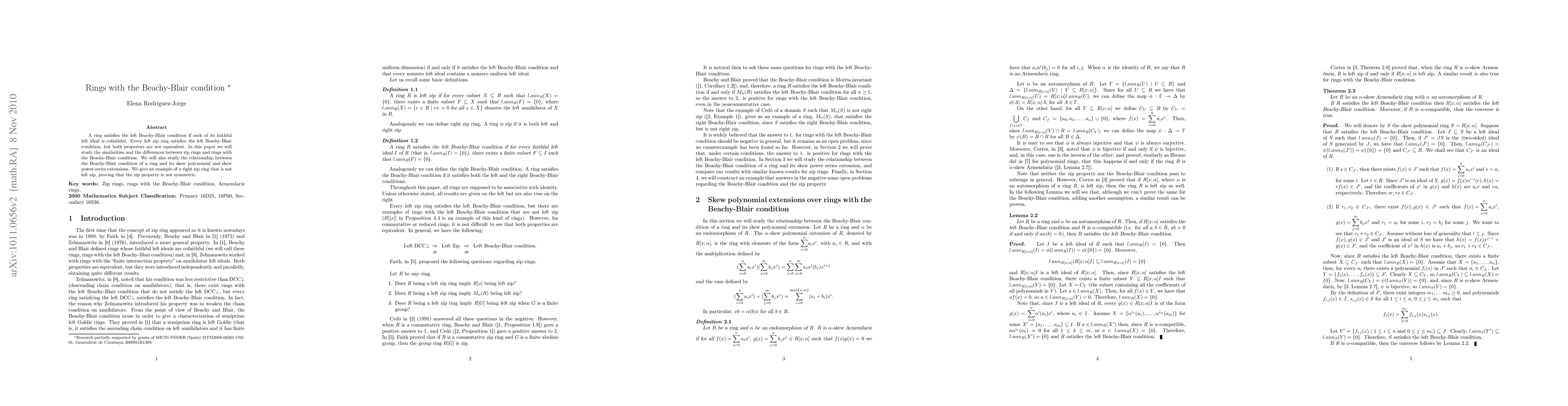 This paper studies rings with the Beachy-Blair condition, comparing similarities to zip rings and exploring its relation to skew polynomial and power series extensions. It also highlights key differences between these ring types.