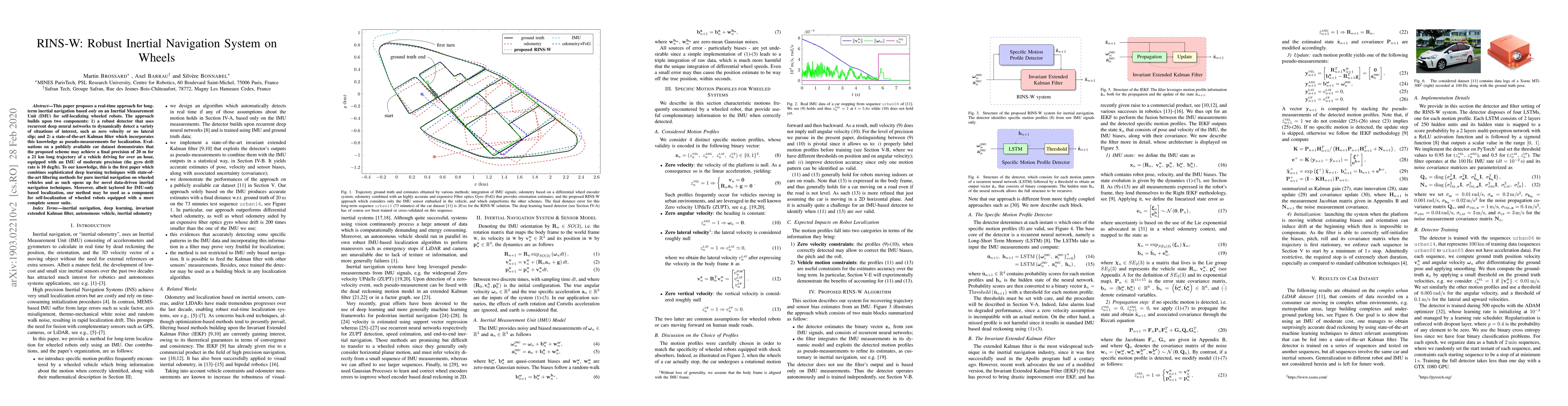 This paper introduces RINS-W, a real-time inertial navigation system for wheeled robots using only an IMU, combining deep learning for situation detection and a Kalman filter for localization, achieving 20 m precision over 21 km. It represents the first fusion of deep learning and advanced filtering for pure inertial navigation in wheeled vehicles.