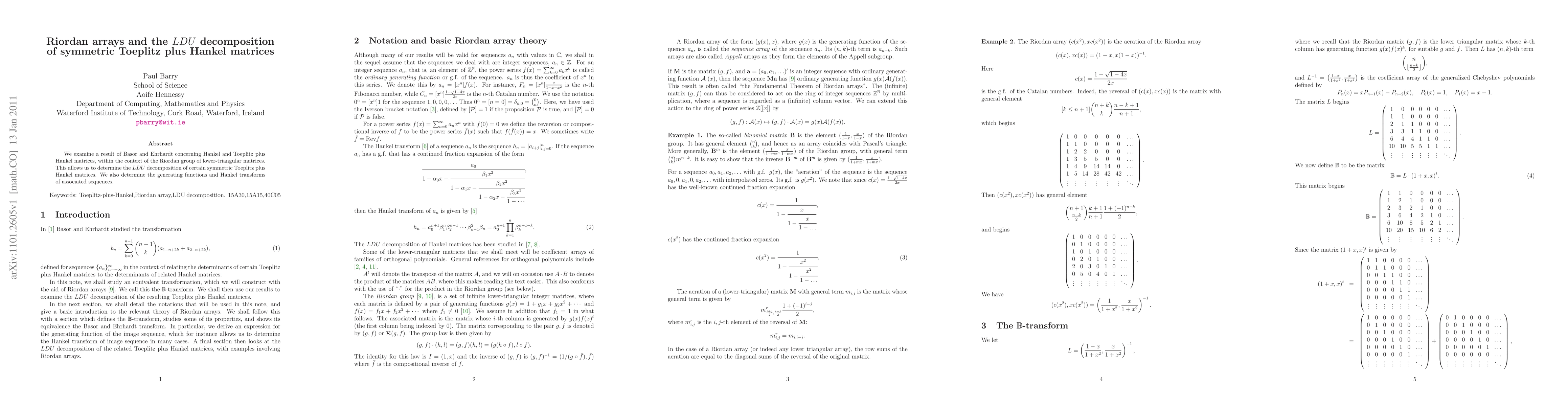 The research examines Hankel and Toeplitz plus Hankel matrices within the context of the Riordan group of lower-triangular matrices, leading to the determination of the LDU decomposition of certain symmetric Toeplitz plus Hankel matrices and the generating functions and Hankel transforms of associated sequences.