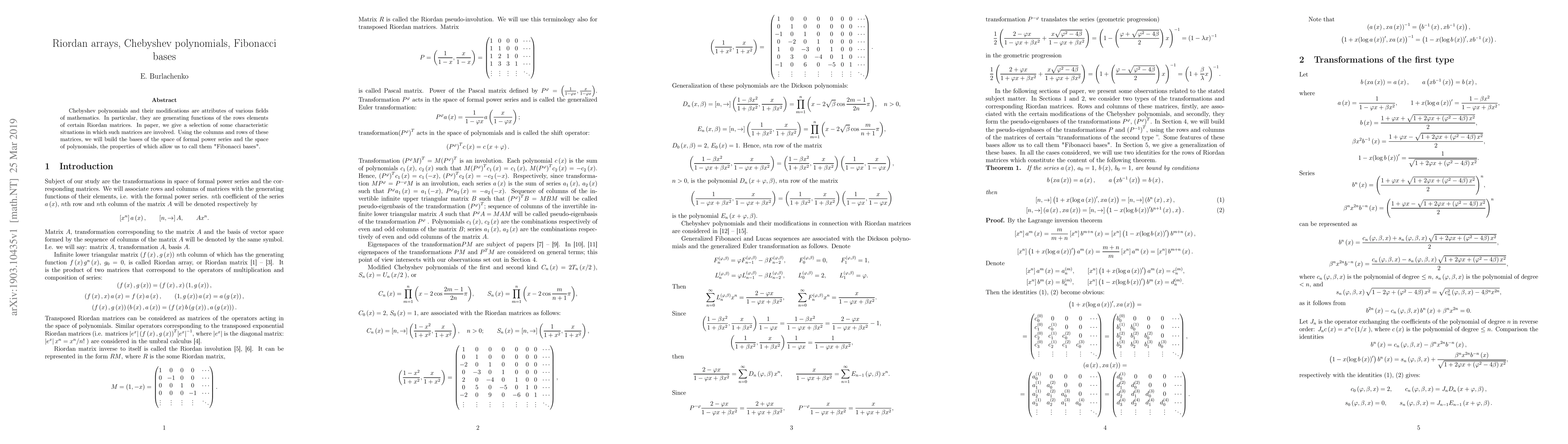This paper explores the relationship between Chebyshev polynomials and Riordan arrays, demonstrating how these matrices generate "Fibonacci bases" for formal power series and polynomial spaces. The study highlights specific instances where these matrices play a significant role.