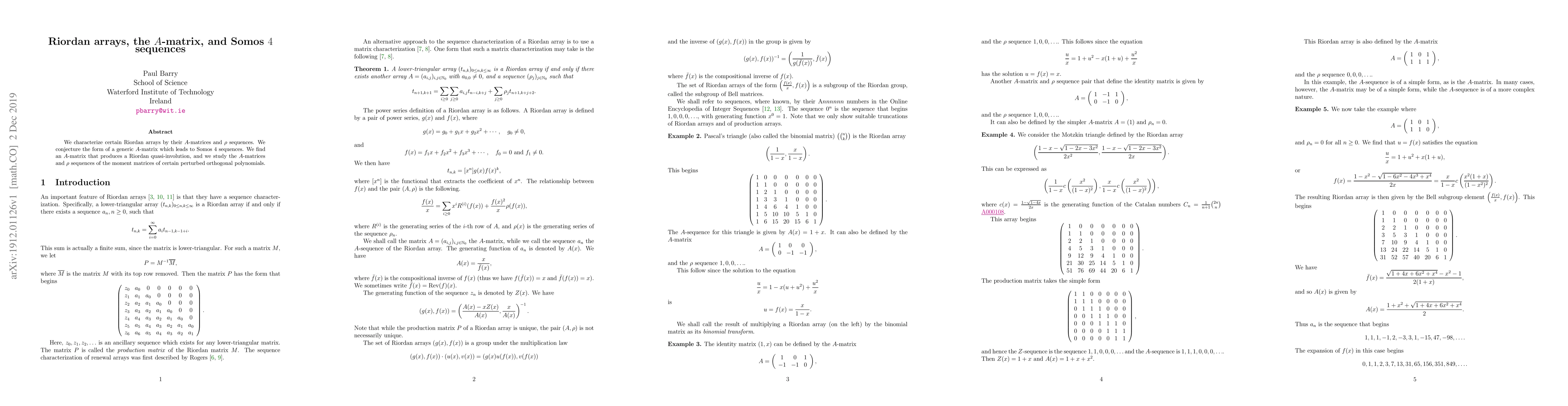 This paper characterizes Riordan arrays through their $A$-matrices and $\rho$ sequences, proposing a conjecture for the $A$-matrix form that generates Somos $4$ sequences. It also identifies an $A$-matrix that creates a Riordan quasi-involution and examines $A$-matrices and $\rho$ sequences in moment matrices of perturbed orthogonal polynomials.
