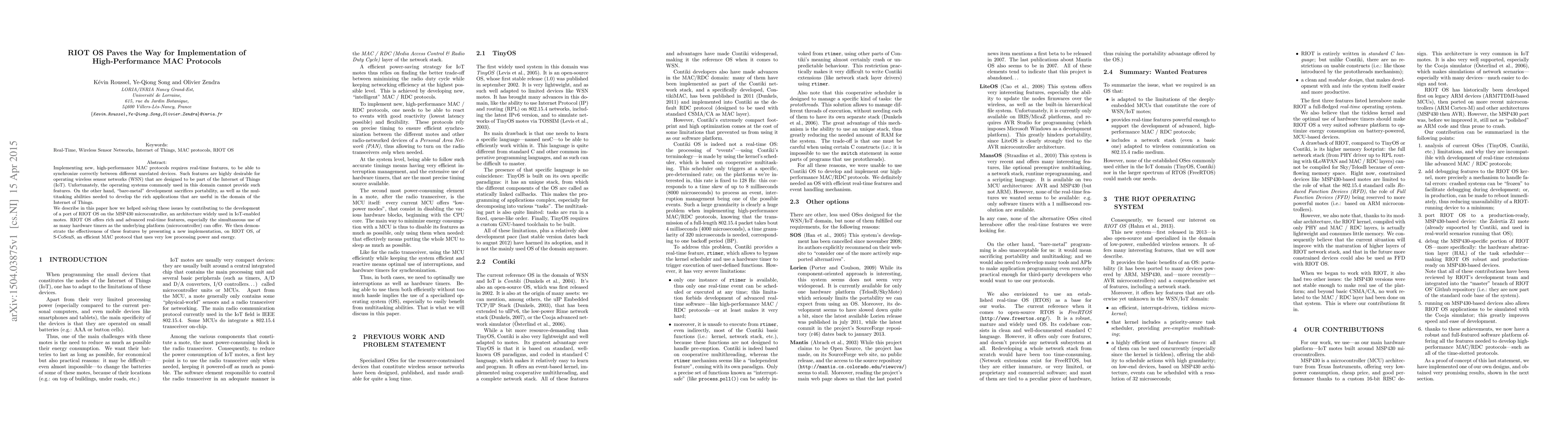 Implementing new, high-performance MAC protocols requires real-time features, to be able to synchronize correctly between different unrelated devices. Such features are highly desirable for operating wireless sensor networks (WSN) that are designed to be part of the Internet of Things (IoT). Unfortunately, the operating systems commonly used in this domain cannot provide such features. On the other hand, "bare-metal" development sacrifices portability, as well as the mul-titasking abilities needed to develop the rich applications that are useful in the domain of the Internet of Things. We describe in this paper how we helped solving these issues by contributing to the development of a port of RIOT OS on the MSP430 microcontroller, an architecture widely used in IoT-enabled motes. RIOT OS offers rich and advanced real-time features, especially the simultaneous use of as many hardware timers as the underlying platform (microcontroller) can offer. We then demonstrate the effectiveness of these features by presenting a new implementation, on RIOT OS, of S-CoSenS, an efficient MAC protocol that uses very low processing power and energy.