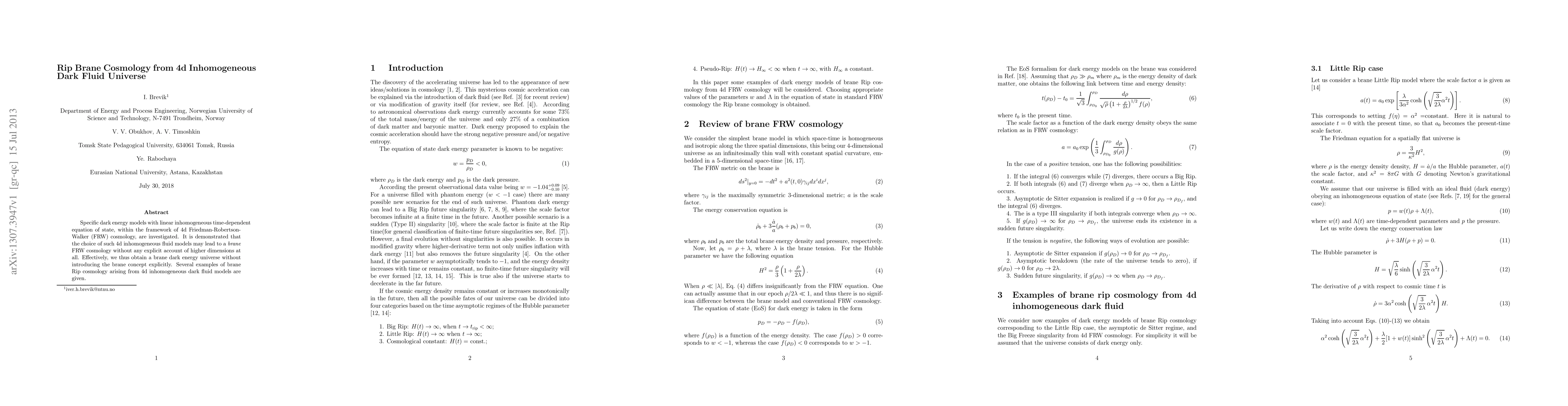 Specific dark energy models with linear inhomogeneous time-dependent equation of state, within the framework of 4d Friedman-Robertson-Walker (FRW) cosmology, are investigated. It is demonstrated that the choice of such 4d inhomogeneous fluid models may lead to a brane FRW cosmology without any explicit account of higher dimensions at all. Effectively, we thus obtain a brane dark energy universe without introducing the brane concept explicitly. Several examples of brane Rip cosmology arising from 4d inhomogeneous dark fluid models are given.