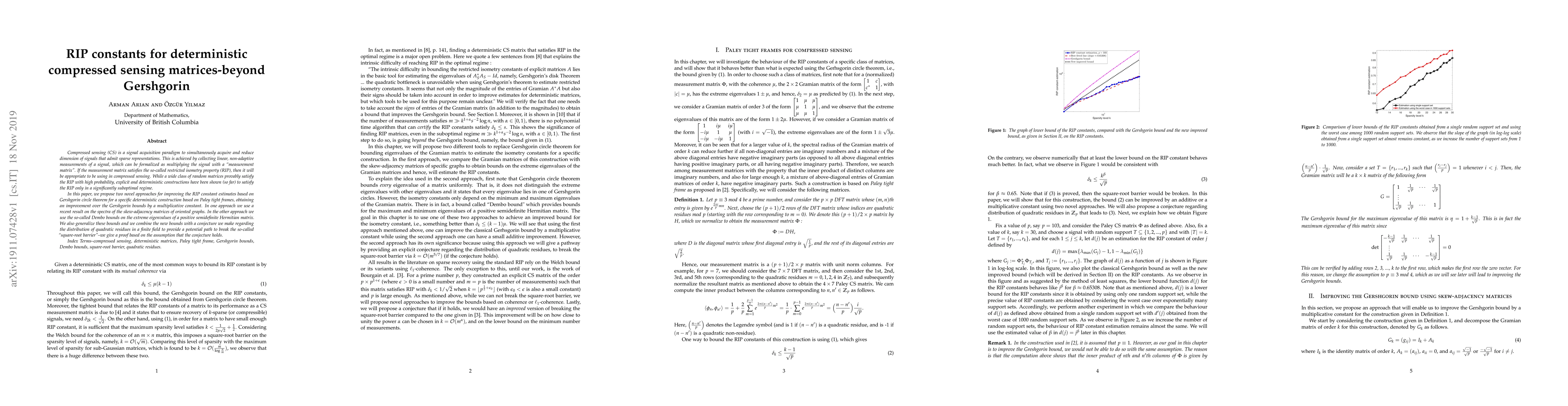 Compressed sensing (CS) is a signal acquisition paradigm to simultaneously acquire and reduce dimension of signals that admit sparse representations. This is achieved by collecting linear, non-adaptive measurements of a signal, which can be formalized as multiplying the signal with a "measurement matrix". If the measurement satisfies the so-called restricted isometry property (RIP), then it will be appropriate to be used in compressed sensing. While a wide class of random matrices provably satisfy the RIP with high probability, explicit and deterministic constructions have been shown (so far) to satisfy the RIP only in a significantly suboptimal regime. In this paper, we propose two novel approaches for improving the RIP constant estimates based on Gershgorin circle theorem for a specific deterministic construction based on Paley tight frames, obtaining an improvement over the Gershgorin bound by a multiplicative constant. In one approach we use a recent result on the spectra of the skew-adjacency matrices of oriented graphs. In the other approach, we use the so-called Dembo bounds on the extreme eigenvalues of a positive semidefinite Hermitian matrix. We also generalize these bounds and we combine the new bounds with a conjecture we make regarding the distribution of quadratic residues in a finite field to provide a potential path to break the so-called "square-root barrier"-we provide a proof based on the assumption that the conjecture holds.
