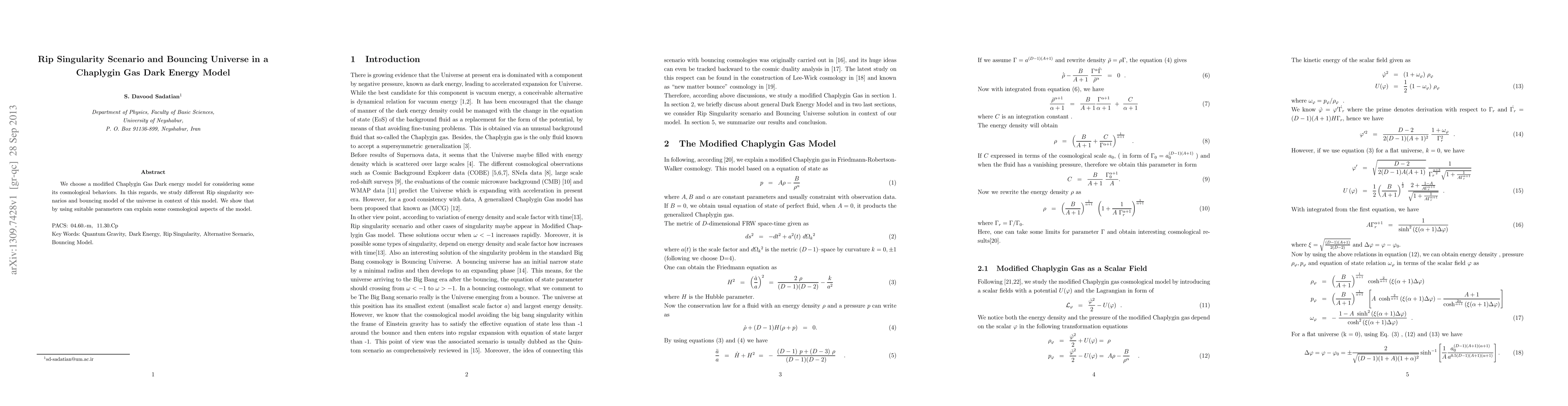 This paper explores a modified Chaplygin Gas Dark energy model, examining Rip singularity scenarios and bouncing universe models to explain various cosmological phenomena. By adjusting parameters, it shows promise in explaining certain aspects of the model.