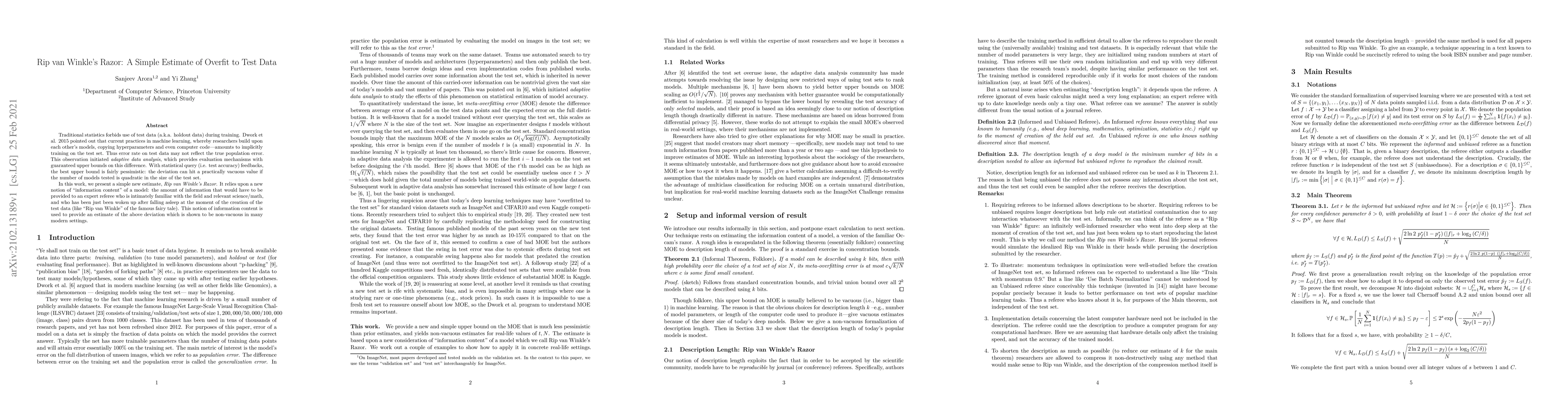 Traditional statistics forbids use of test data (a.k.a. holdout data) during training. Dwork et al. 2015 pointed out that current practices in machine learning, whereby researchers build upon each other's models, copying hyperparameters and even computer code -- amounts to implicitly training on the test set. Thus error rate on test data may not reflect the true population error. This observation initiated {\em adaptive data analysis}, which provides evaluation mechanisms with guaranteed upper bounds on this difference. With statistical query (i.e. test accuracy) feedbacks, the best upper bound is fairly pessimistic: the deviation can hit a practically vacuous value if the number of models tested is quadratic in the size of the test set. In this work, we present a simple new estimate, {\em Rip van Winkle's Razor}. It relies upon a new notion of \textquotedblleft information content\textquotedblright\ of a model: the amount of information that would have to be provided to an expert referee who is intimately familiar with the field and relevant science/math, and who has been just been woken up after falling asleep at the moment of the creation of the test data (like \textquotedblleft Rip van Winkle\textquotedblright\ of the famous fairy tale). This notion of information content is used to provide an estimate of the above deviation which is shown to be non-vacuous in many modern settings.