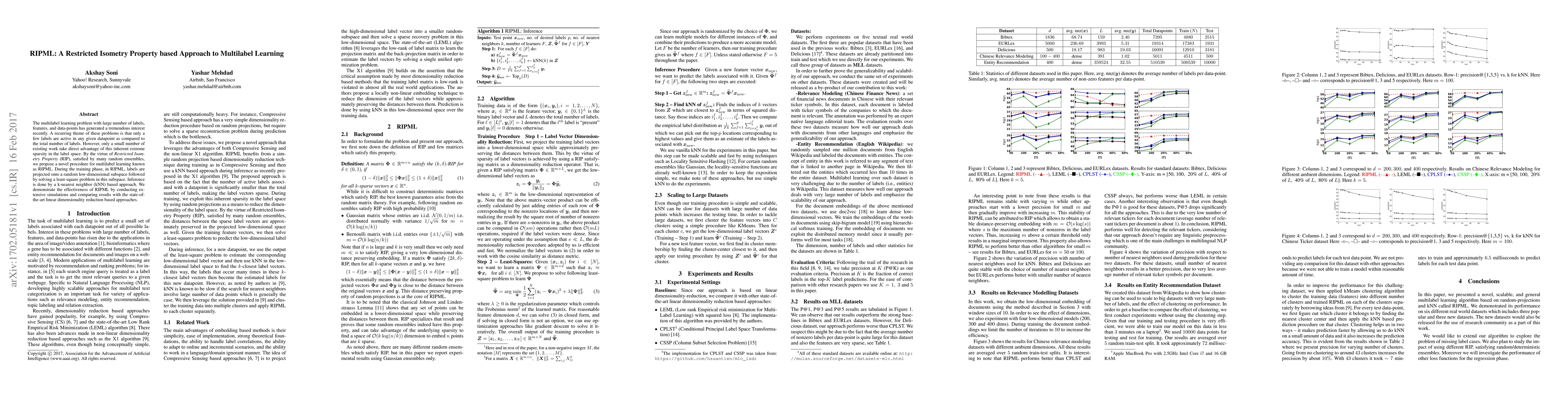 The multilabel learning problem with large number of labels, features, and data-points has generated a tremendous interest recently. A recurring theme of these problems is that only a few labels are active in any given datapoint as compared to the total number of labels. However, only a small number of existing work take direct advantage of this inherent extreme sparsity in the label space. By the virtue of Restricted Isometry Property (RIP), satisfied by many random ensembles, we propose a novel procedure for multilabel learning known as RIPML. During the training phase, in RIPML, labels are projected onto a random low-dimensional subspace followed by solving a least-square problem in this subspace. Inference is done by a k-nearest neighbor (kNN) based approach. We demonstrate the effectiveness of RIPML by conducting extensive simulations and comparing results with the state-of-the-art linear dimensionality reduction based approaches.
