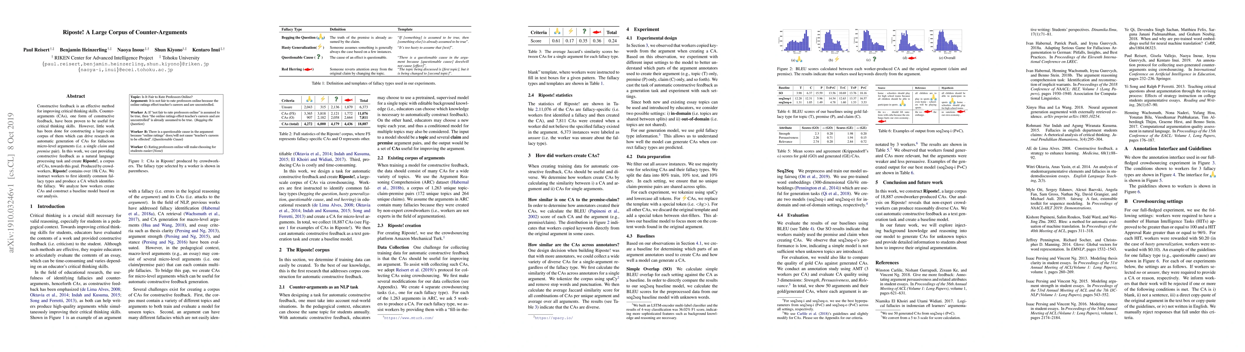 Constructive feedback is an effective method for improving critical thinking skills. Counter-arguments (CAs), one form of constructive feedback, have been proven to be useful for critical thinking skills. However, little work has been done for constructing a large-scale corpus of them which can drive research on automatic generation of CAs for fallacious micro-level arguments (i.e. a single claim and premise pair). In this work, we cast providing constructive feedback as a natural language processing task and create Riposte!, a corpus of CAs, towards this goal. Produced by crowdworkers, Riposte! contains over 18k CAs. We instruct workers to first identify common fallacy types and produce a CA which identifies the fallacy. We analyze how workers create CAs and construct a baseline model based on our analysis.