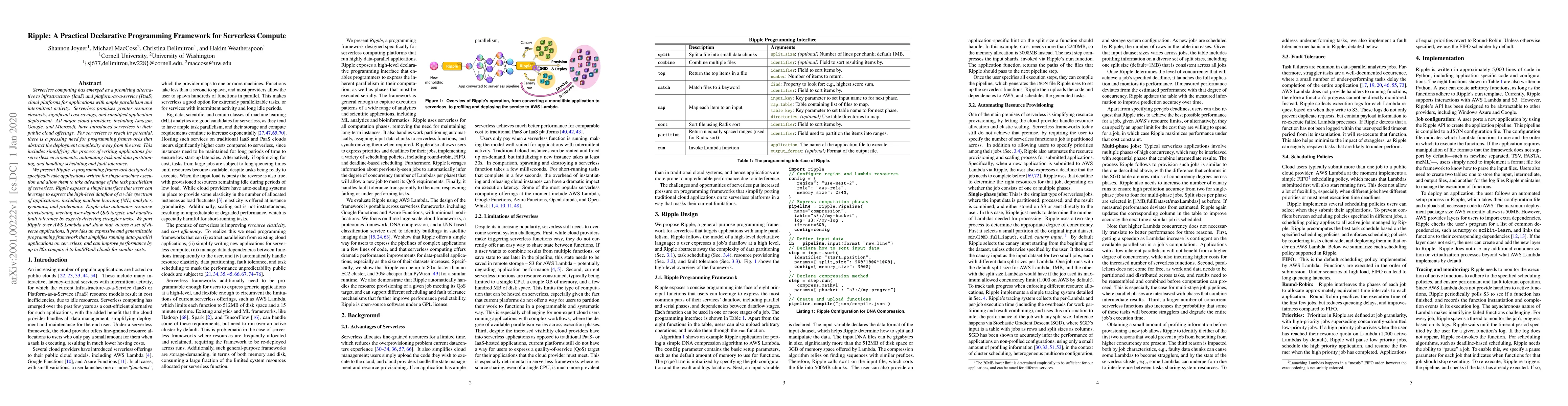 Ripple is a declarative programming framework designed to simplify the development of data-parallel applications for serverless environments, automating resource provisioning and fault tolerance. It enables users to express high-level dataflows and achieves up to 80x performance improvement over traditional IaaS/PaaS clouds for similar costs.
