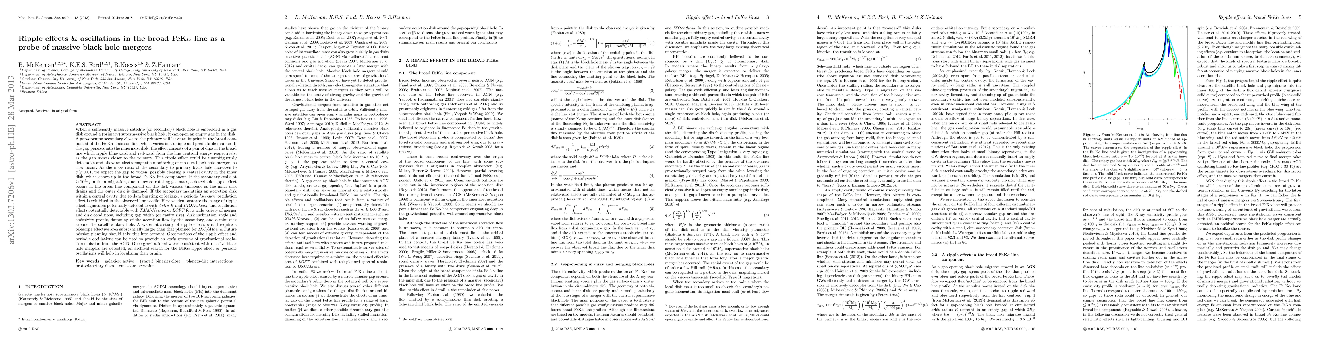 (abridged) When a sufficiently massive satellite (or secondary) black hole is embedded in a gas disk around a (primary) supermassive black hole, it can open an empty gap in the disk. A gap-opening secondary close to the primary will leave an imprint in the broad component of the FeKa emission line, which varies in a unique and predictable manner. If the gap persists into the innermost disk, the effect consists of a pair of dips in the broad line which ripple blue-ward and red-ward from the line centroid energy respectively, as the gap moves closer to the primary. This ripple effect could be unambiguously detectable and allow an electromagnetic monitoring of massive black hole mergers as they occur. As the mass ratio of the secondary to primary black hole increases to q>0.01, we expect the gap to widen, possibly clearing a central cavity in the inner disk, which shows up in the broad FeKa line component. If the secondary stalls at >100r_{g} in its in-migration, due to low co-rotating gas mass, a detectable ripple effect occurs in the broad line component on the disk viscous timescale as the inner disk drains and the outer disk is dammed. If the secondary maintains an accretion disk within a central cavity, due to dam bursting or leakage, a periodic 'see-saw' oscillation effect is exhibited in the observed line profile. Here we demonstrate the range of ripple effect signatures potentially detectable with Astro-H and IXO/Athena, and oscillation effects potentially detectable with XMM or LOFT for a wide variety of merger and disk conditions. Observations of the ripple effect and periodic oscillations can be used to provide an early warning of gravitational radiation emission from the AGN.