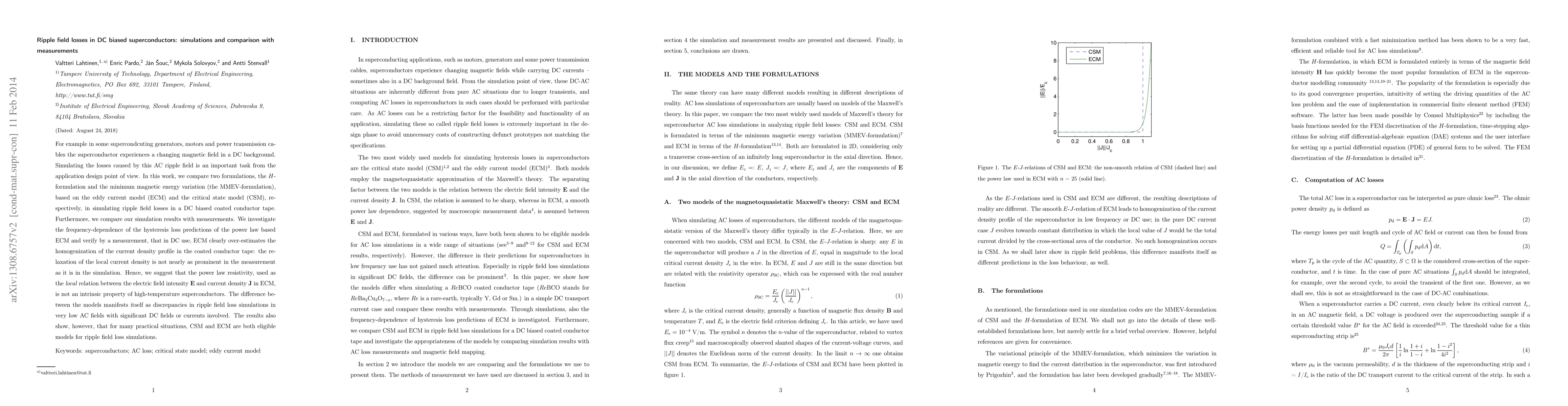 This paper compares the $H$-formulation and the MMEV-formulation for simulating ripple field losses in DC biased superconductors, finding that the ECM over-estimates current density relaxation compared to measurements. It concludes that the power law resistivity in ECM may not be intrinsic to high-temperature superconductors, though both CSM and ECM show practical eligibility for ripple field loss simulations.