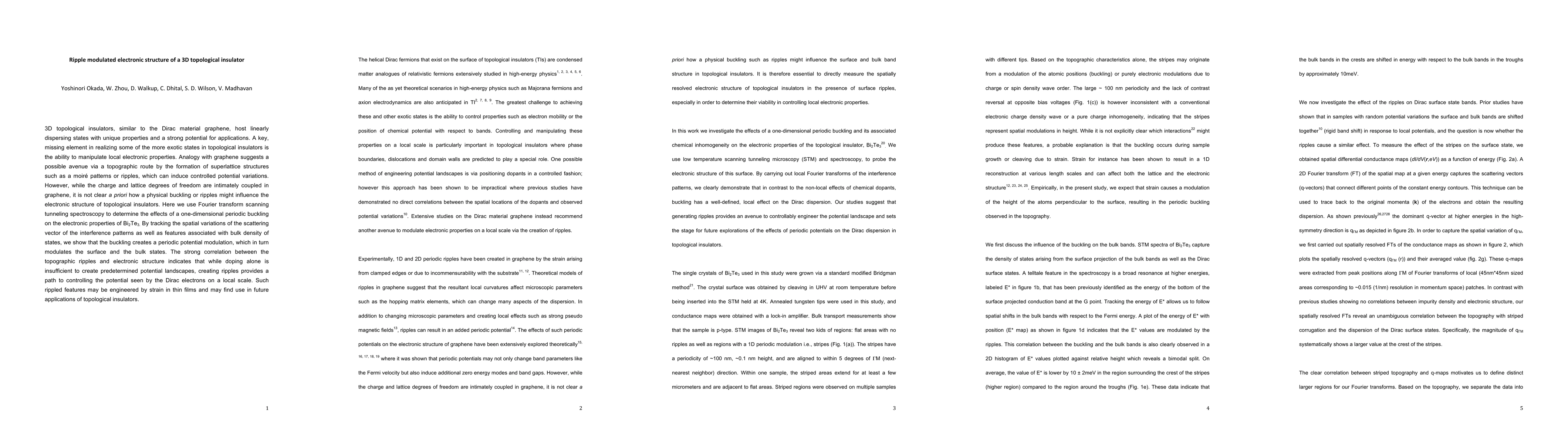 3D topological insulators, similar to the Dirac material graphene, host linearly dispersing states with unique properties and a strong potential for applications. A key, missing element in realizing some of the more exotic states in topological insulators is the ability to manipulate local electronic properties. Analogy with graphene suggests a possible avenue via a topographic route by the formation of superlattice structures such as a moir\'e patterns or ripples, which can induce controlled potential variations. However, while the charge and lattice degrees of freedom are intimately coupled in graphene, it is not clear a priori how a physical buckling or ripples might influence the electronic structure of topological insulators. Here we use Fourier transform scanning tunneling spectroscopy to determine the effects of a one-dimensional periodic buckling on the electronic properties of Bi2Te3. By tracking the spatial variations of the scattering vector of the interference patterns as well as features associated with bulk density of states, we show that the buckling creates a periodic potential modulation, which in turn modulates the surface and the bulk states. The strong correlation between the topographic ripples and electronic structure indicates that while doping alone is insufficient to create predetermined potential landscapes, creating ripples provides a path to controlling the potential seen by the Dirac electrons on a local scale. Such rippled features may be engineered by strain in thin films and may find use in future applications of topological insulators.