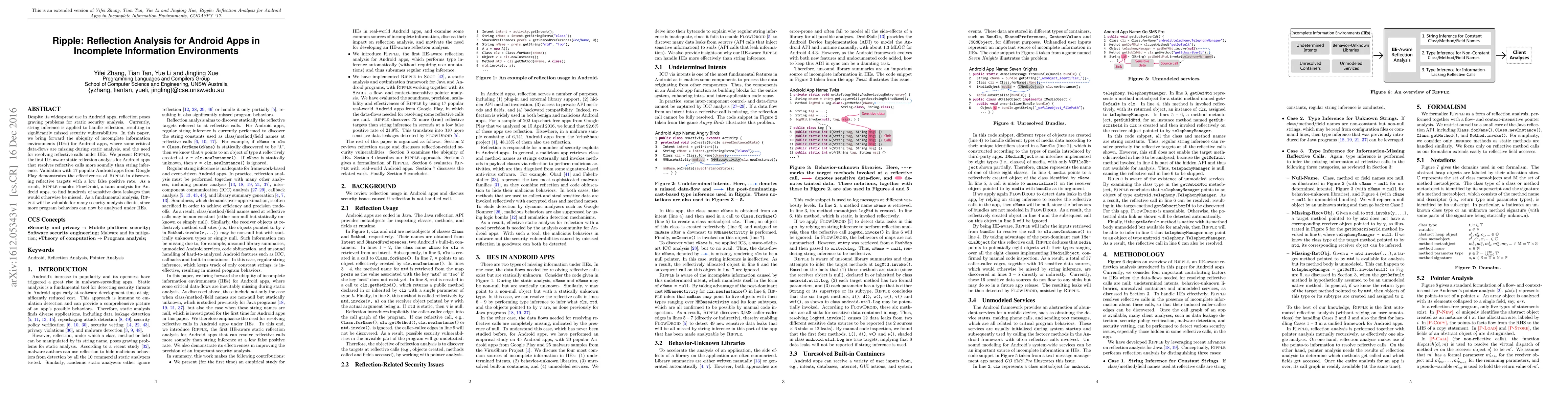 Ripple introduces a novel static reflection analysis method to address security vulnerabilities in Android apps under incomplete information environments (IIEs). It resolves reflective calls more accurately than string inference, enabling FlowDroid to discover hundreds of previously missed sensitive data leakages in 17 popular Google Play apps.
