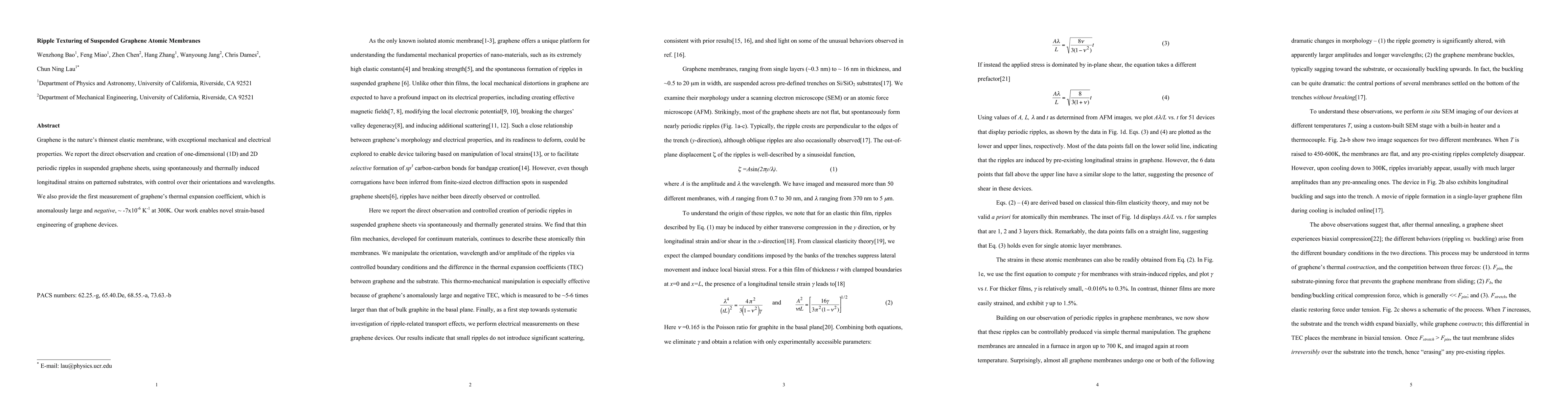 This study observes and induces one-dimensional and two-dimensional ripples in suspended graphene membranes via spontaneous and thermal strains, demonstrating control over ripple orientations and wavelengths. It also measures graphene's unusually large and negative thermal expansion coefficient, enabling new strain-based engineering possibilities for graphene devices.
