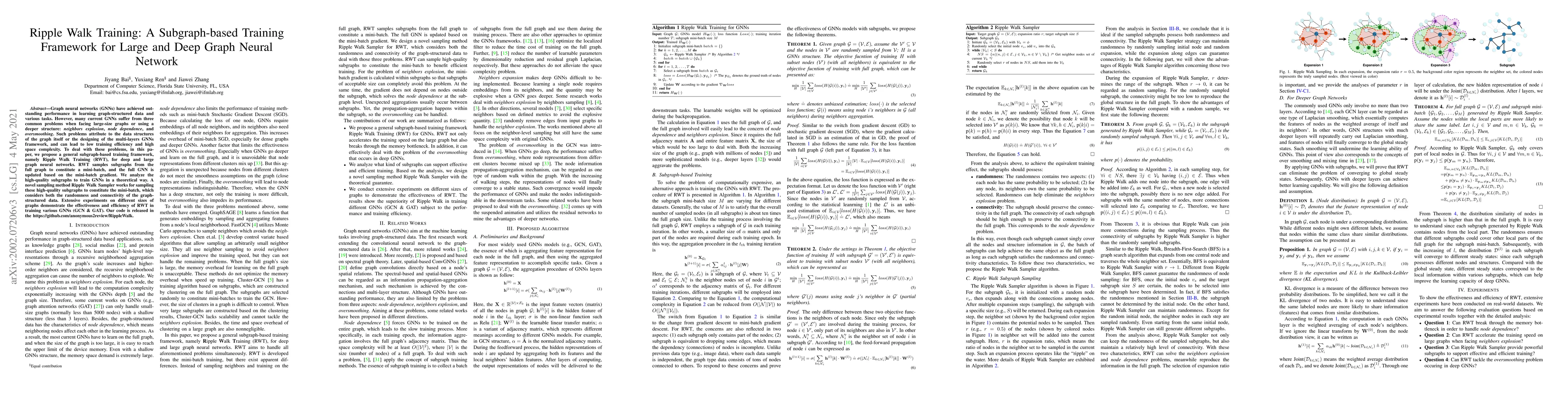 This paper proposes Ripple Walk Training (RWT), a subgraph-based framework for training large and deep graph neural networks (GNNs) to address issues like neighbors explosion, node dependence, and oversmoothing. RWT samples high-quality subgraphs for mini-batch training, improving efficiency and reducing space complexity.