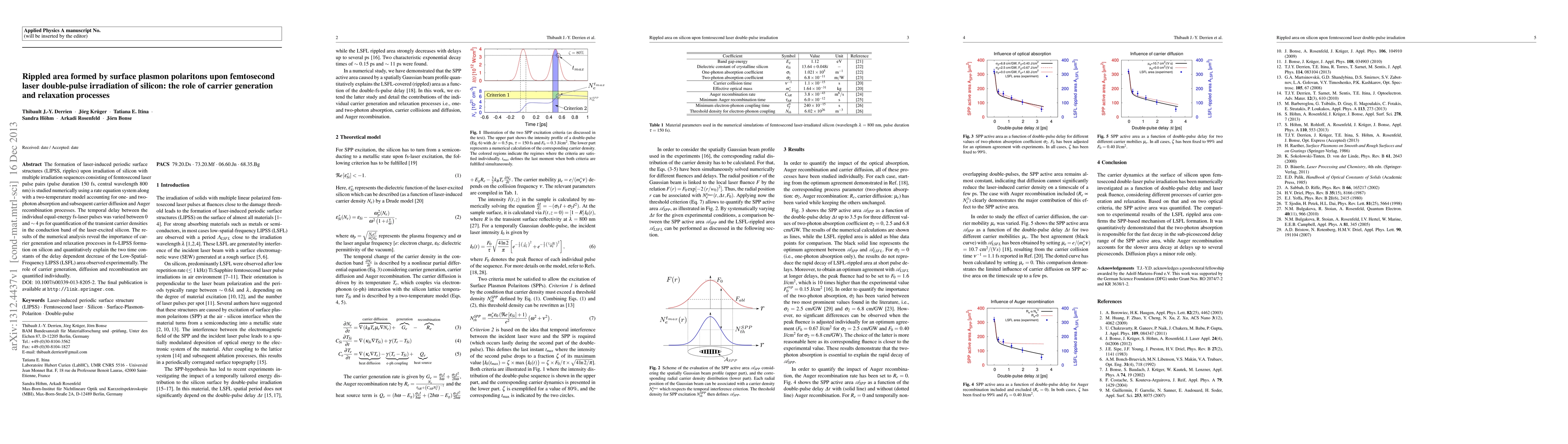 This paper numerically investigates the formation of laser-induced periodic surface structures (LIPSS) on silicon using femtosecond laser double pulses, emphasizing the role of carrier generation and relaxation processes. The study quantifies the transient carrier densities and explains the experimentally observed two time constants in the LIPSS area reduction.