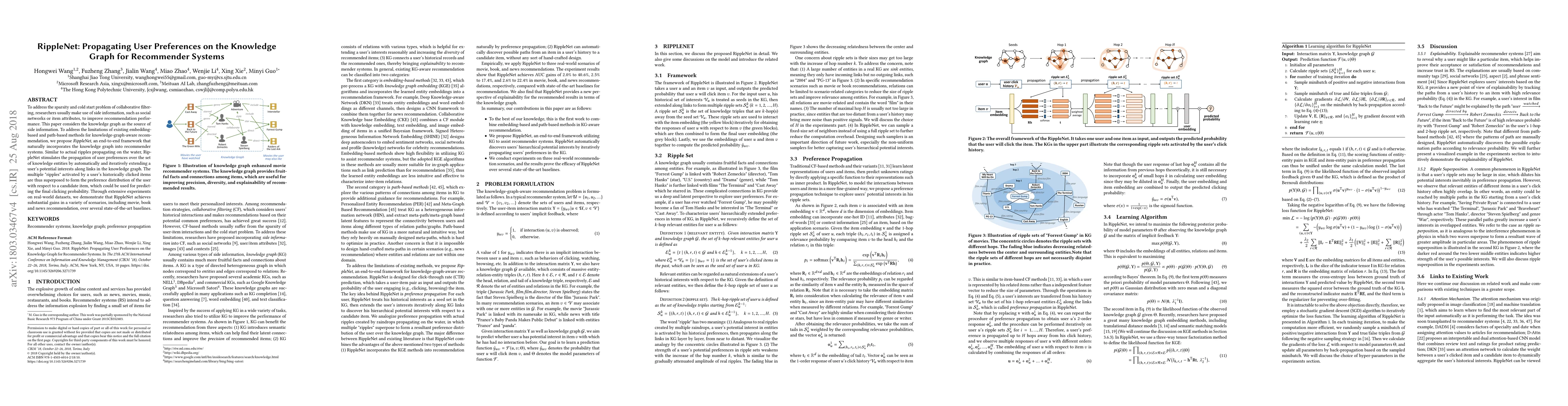 This paper proposes Ripple Network, a framework that integrates knowledge graphs into recommender systems to address sparsity and cold start issues. It propagates user preferences through the knowledge graph, achieving better performance in movie, book, and news recommendations compared to existing methods.
