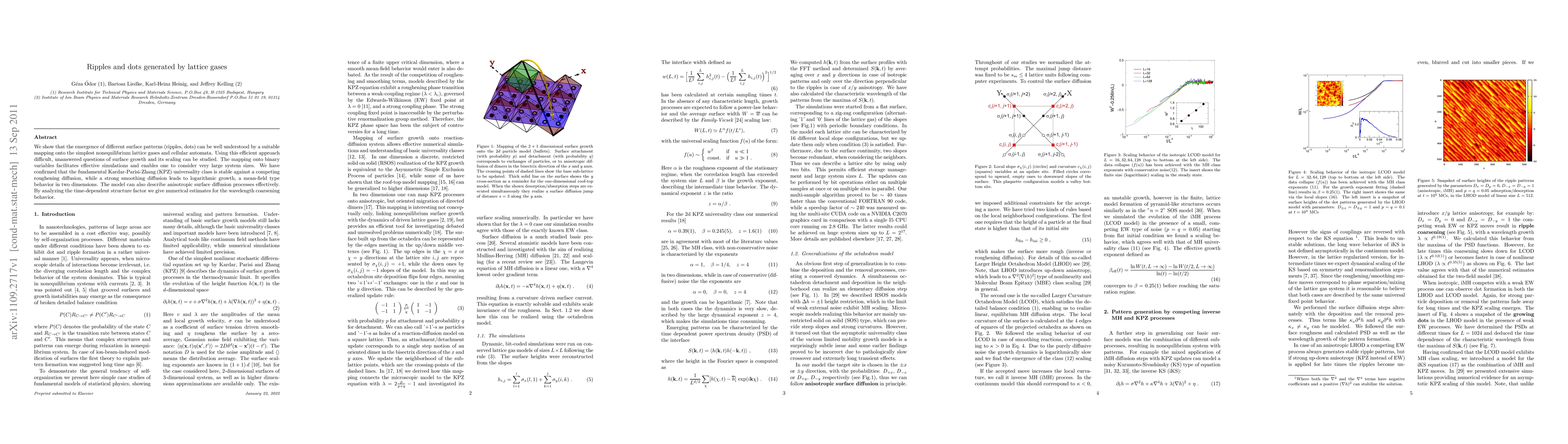 We show that the emergence of different surface patterns (ripples, dots) can be well understood by a suitable mapping onto the simplest nonequilibrium lattice gases and cellular automata.Using this efficient approach difficult, unanswered questions of surface growth and its scaling can be studied. The mapping onto binary variables facilitates effective simulations and enables one to consider very large system sizes.We have confirmed that the fundamental Kardar-Parisi-Zhang (KPZ) universality class is stable against a competing roughening diffusion,while a strong smoothing diffusion leads to logarithmic growth, a mean-field type behavior in two dimensions.The model can also describe anisotropic surface diffusion processes effectively. By analyzing the time-dependent structure factor we give numerical estimates for the wavelength coarsening behavior.