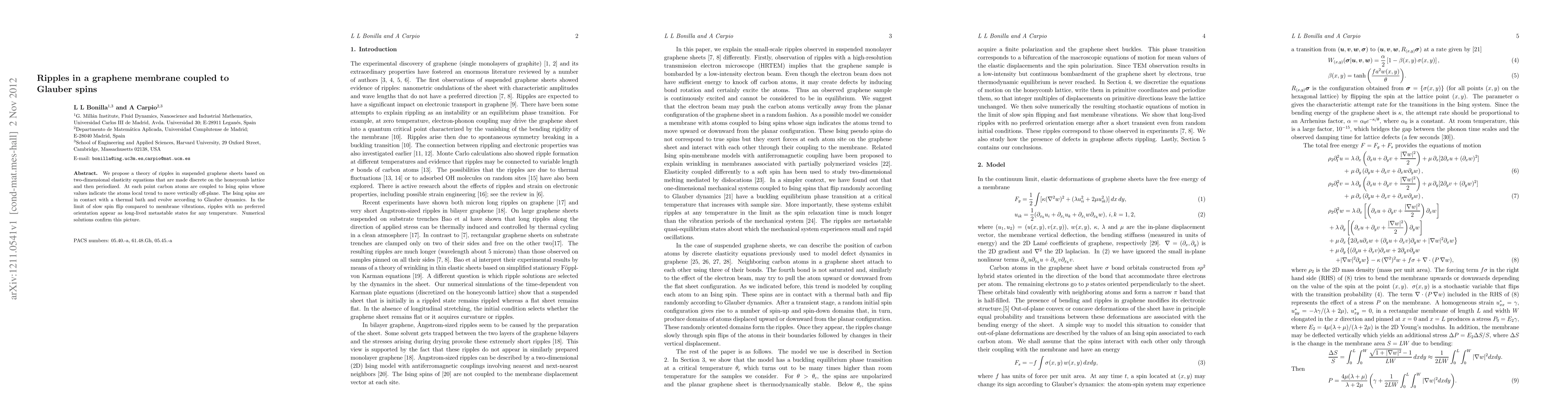 This paper develops a theoretical framework for ripples in graphene sheets using discrete two-dimensional elasticity on a honeycomb lattice, where carbon atoms are coupled to Glauber dynamics-driven Ising spins. It finds that ripples emerge as long-lived metastable states at any temperature due to the slow spin flip dynamics relative to membrane vibrations.
