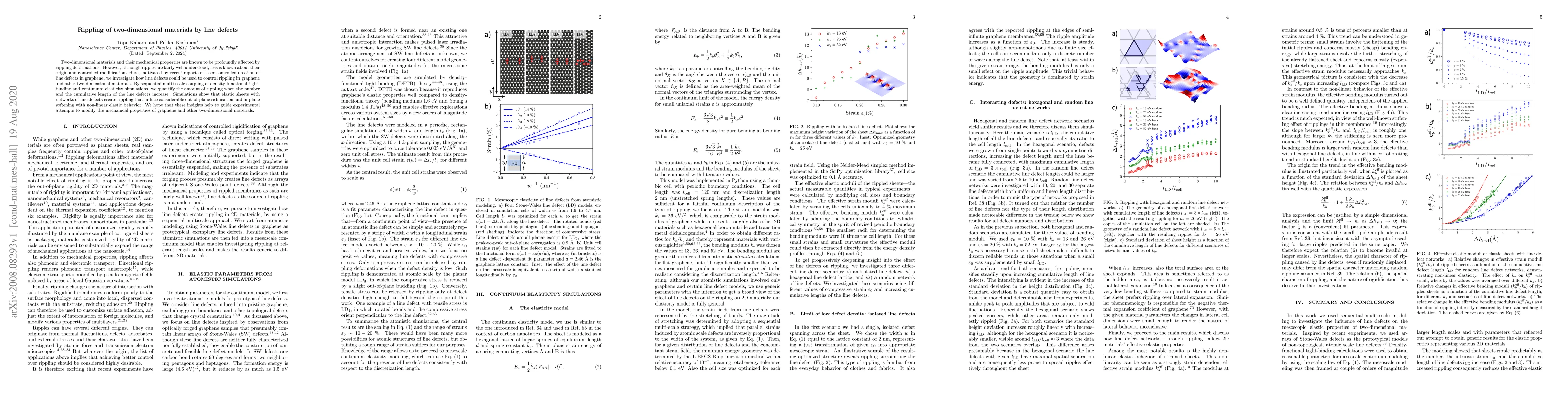 This research investigates the control of rippling in two-dimensional materials like graphene through the introduction of line defects, demonstrating that such defects can induce significant out-of-plane rigidification and in-plane softening, with nonlinear elastic behavior, based on multi-scale simulation results.