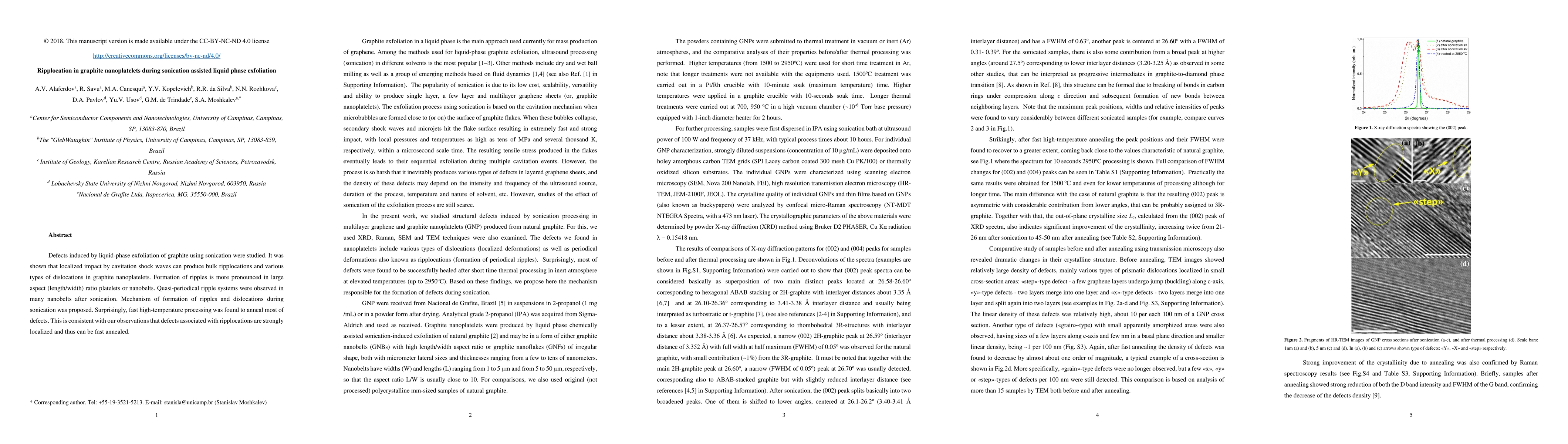 The paper investigates defect formation in graphite nanoplatelets during sonication-assisted liquid phase exfoliation, revealing ripplelocation and dislocations caused by cavitation shock waves. Ripples are more common in large aspect ratio platelets and can form quasi-periodic systems. Surprisingly, rapid high-temperature processing anneals most defects due to their localized nature.