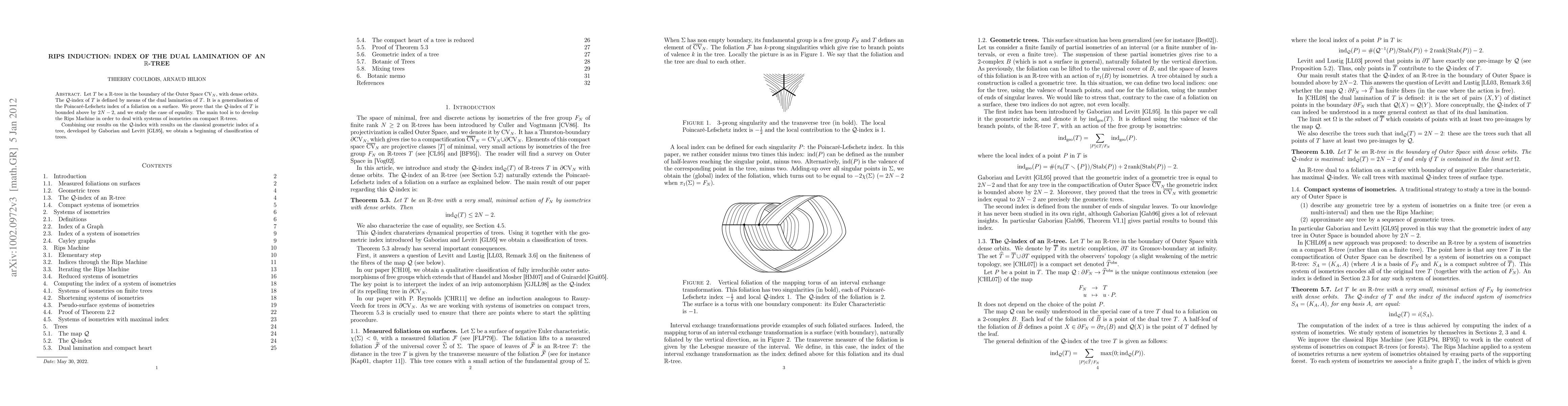 Let $T$ be a $\R$-tree in the boundary of the Outer Space CV$_N$, with dense orbits. The $Q$-index of $T$ is defined by means of the dual lamination of $T$. It is a generalisation of the Euler-Poincar\'e index of a foliation on a surface. We prove that the $Q$-index of $T$ is bounded above by $2N-2$, and we study the case of equality. The main tool is to develop the Rips Machine in order to deal with systems of isometries on compact $\R$-trees. Combining our results on the $\CQ$-index with results on the classical geometric index of a tree, we obtain a beginning of classification of trees. As a consequence, we give a classification of iwip outer automorphisms of the free group, by discussing the properties of their attracting and repelling trees.
