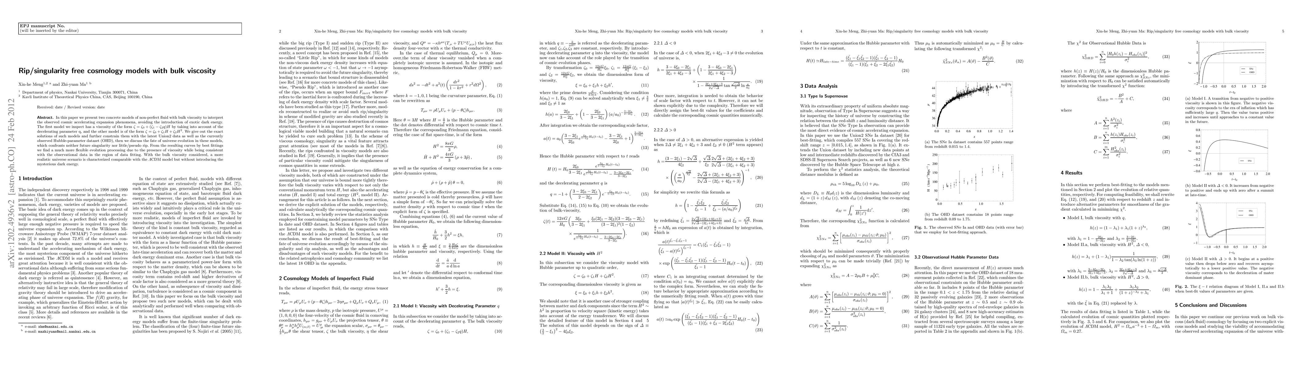 In this paper we present two concrete models of non-perfect fluid with bulk viscosity to interpret the observed cosmic accelerating expansion phenomena, avoiding the introduction of exotic dark energy. The first model we inspect has a viscosity of the form ${\zeta} = {\zeta}_0 + ({\zeta}_1-{\zeta}_2q)H$ by taking into account of the decelerating parameter q, and the other model is of the form ${\zeta} = {\zeta}_0 + {\zeta}_1H + {\zeta}_2H^2$. We give out the exact solutions of such models and further constrain them with the latest Union2 data as well as the currently observed Hubble-parameter dataset (OHD), then we discuss the fate of universe evolution in these models, which confronts neither future singularity nor little/pseudo rip. From the resulting curves by best fittings we find a much more flexible evolution processing due to the presence of viscosity while being consistent with the observational data in the region of data fitting. With the bulk viscosity considered, a more realistic universe scenario is characterized comparable with the {\Lambda}CDM model but without introducing the mysterious dark energy.