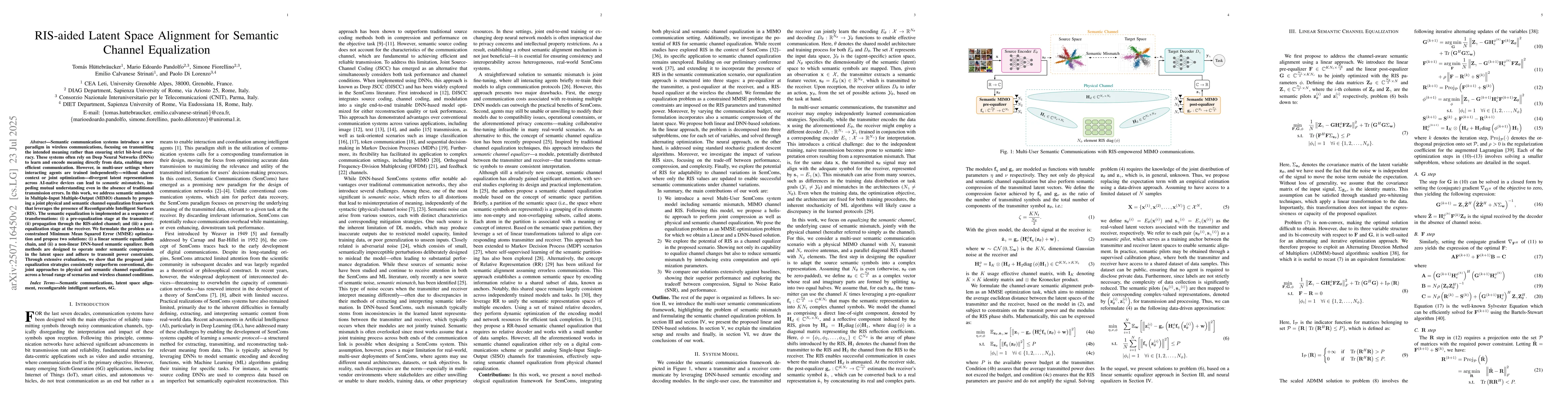 Semantic communication systems introduce a new paradigm in wireless communications, focusing on transmitting the intended meaning rather than ensuring strict bit-level accuracy. These systems often rely on Deep Neural Networks (DNNs) to learn and encode meaning directly from data, enabling more efficient communication. However, in multi-user settings where interacting agents are trained independently-without shared context or joint optimization-divergent latent representations across AI-native devices can lead to semantic mismatches, impeding mutual understanding even in the absence of traditional transmission errors. In this work, we address semantic mismatch in Multiple-Input Multiple-Output (MIMO) channels by proposing a joint physical and semantic channel equalization framework that leverages the presence of Reconfigurable Intelligent Surfaces (RIS). The semantic equalization is implemented as a sequence of transformations: (i) a pre-equalization stage at the transmitter; (ii) propagation through the RIS-aided channel; and (iii) a post-equalization stage at the receiver. We formulate the problem as a constrained Minimum Mean Squared Error (MMSE) optimization and propose two solutions: (i) a linear semantic equalization chain, and (ii) a non-linear DNN-based semantic equalizer. Both methods are designed to operate under semantic compression in the latent space and adhere to transmit power constraints. Through extensive evaluations, we show that the proposed joint equalization strategies consistently outperform conventional, disjoint approaches to physical and semantic channel equalization across a broad range of scenarios and wireless channel conditions.