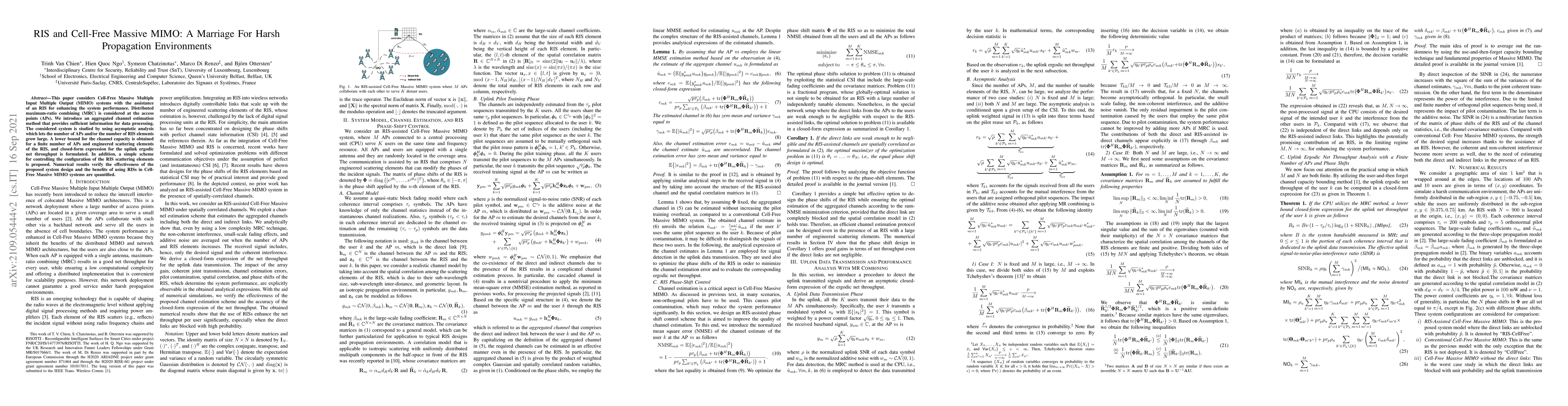 This paper explores the integration of Reconfigurable Intelligent Surfaces (RIS) with Cell-Free Massive MIMO systems to improve performance in harsh propagation environments. It proposes an aggregated channel estimation method and a simple RIS configuration control scheme, demonstrating enhanced channel capacity and uplink throughput through asymptotic analysis and numerical results.