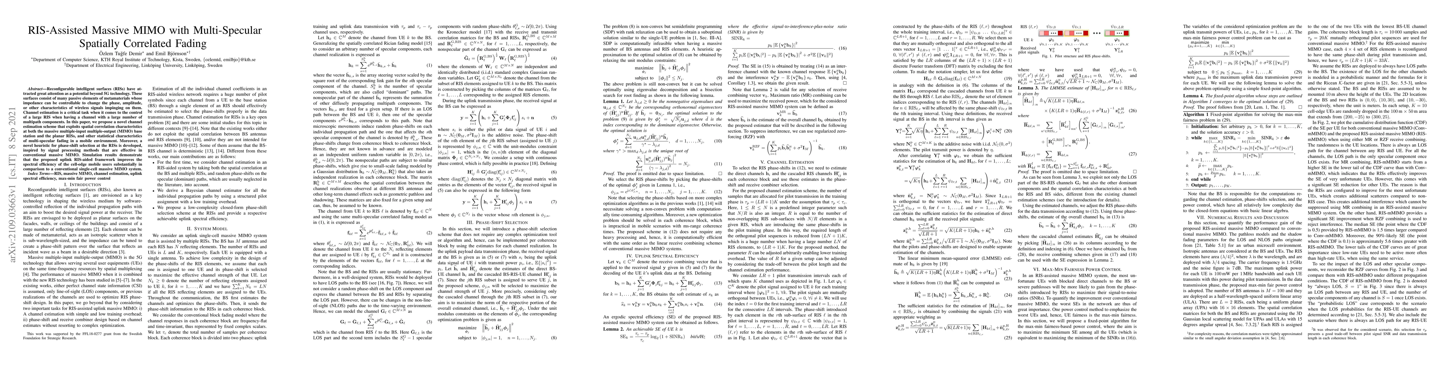 Reconfigurable intelligent surfaces (RISs) have attracted great attention as a potential beyond 5G technology. These surfaces consist of many passive elements of metamaterials whose impedance can be controllable to change the phase, amplitude, or other characteristics of wireless signals impinging on them. Channel estimation is a critical task when it comes to the control of a large RIS when having a channel with a large number of multipath components. In this paper, we propose a novel channel estimation scheme that exploits spatial correlation characteristics at both the massive multiple-input multiple-output (MIMO) base station and the planar RISs, and other statistical characteristics of multi-specular fading in a mobile environment. Moreover, a novel heuristic for phase-shift selection at the RISs is developed, inspired by signal processing methods that are effective in conventional massive MIMO. Simulation results demonstrate that the proposed uplink RIS-aided framework improves the spectral efficiency of the cell-edge mobile users substantially in comparison to a conventional single-cell massive MIMO system.