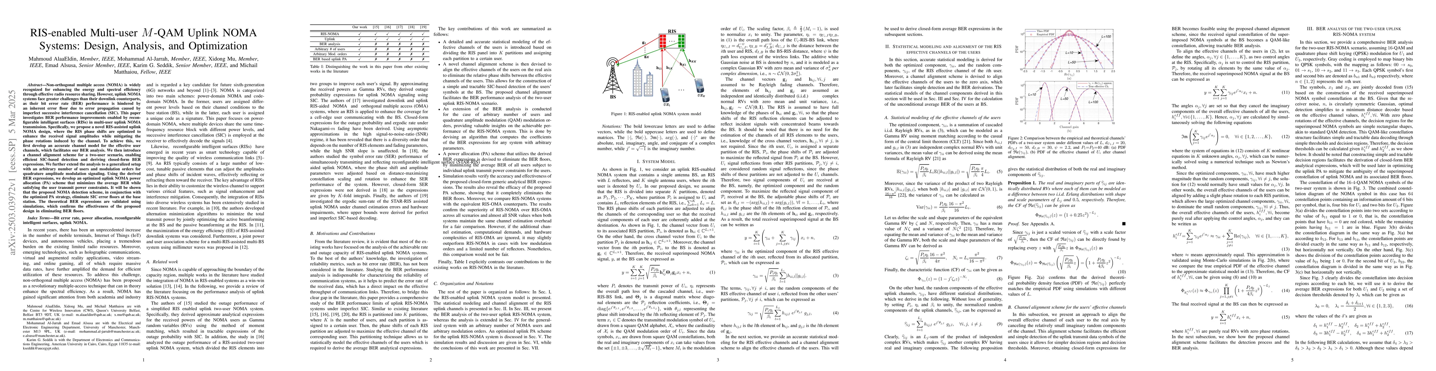 The paper proposes a RIS-assisted uplink NOMA design, develops an accurate channel model for effective user channels, introduces a channel alignment scheme for a two-user scenario, and extends the analysis to a generalized setup with arbitrary users and modulation orders.