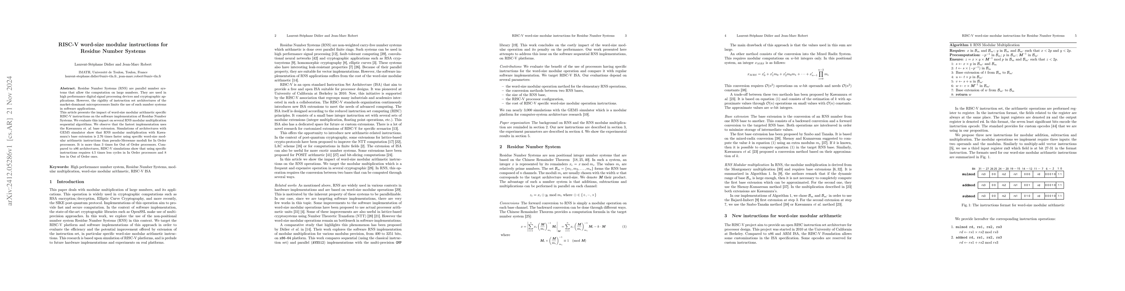 This paper explores RISC-V word-size modular instructions for Residue Number Systems (RNS) to enhance software implementations in digital signal processing and cryptography. Results show significant speedups, with 2.76 times faster RNS modular multiplication using Kawamura's base extension compared to pseudo-Mersenne moduli in In Order processors.
