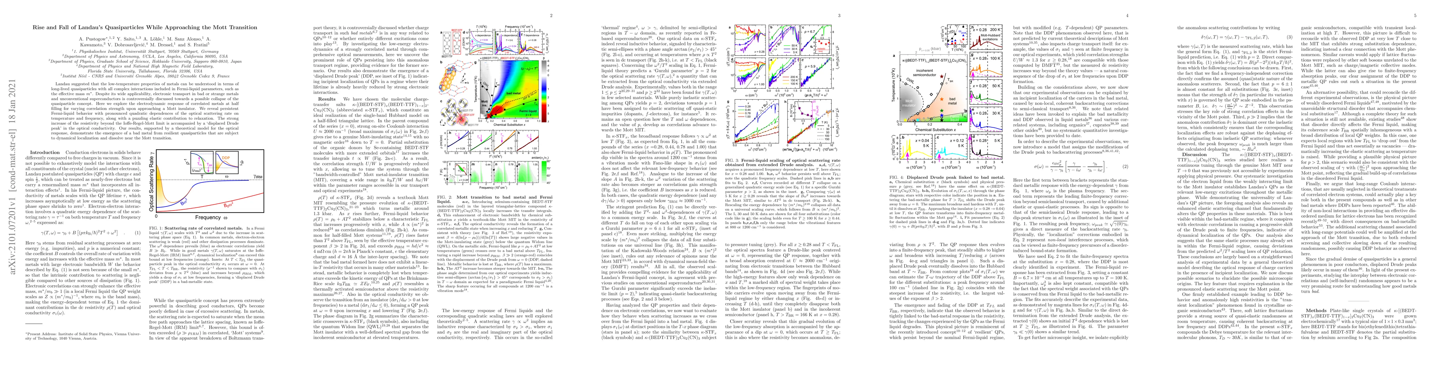 This paper investigates the behavior of Landau quasiparticles in correlated metals as they approach the Mott insulator transition, revealing persistent Fermi-liquid characteristics despite increasing resistivity and a "displaced Drude peak" in optical conductivity, indicating quasiparticles' eventual dissolution near the transition.