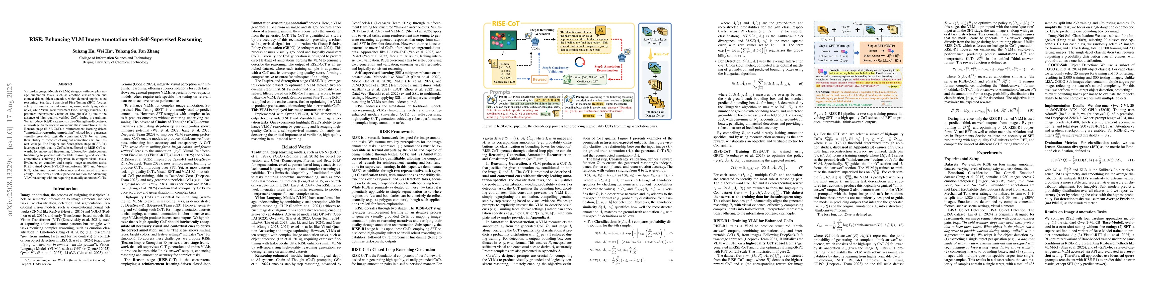 Vision-Language Models (VLMs) struggle with complex image annotation tasks, such as emotion classification and context-driven object detection, which demand sophisticated reasoning. Standard Supervised Fine-Tuning (SFT) focuses solely on annotation outcomes, ignoring underlying rationales, while Visual Reinforcement Fine-Tuning (Visual-RFT) produces inconsistent Chains of Thought (CoTs) due to the absence of high-quality, verified CoTs during pre-training. We introduce RISE (Reason-Inspire-Strengthen-Expertise), a two-stage framework to overcome these limitations. In the Reason stage (RISE-CoT), a reinforcement learning-driven "annotation-reasoning-annotation" closed-loop generates visually grounded, logically consistent CoTs by verifying their ability to reconstruct original annotations without direct leakage. The Inspire and Strengthen stage (RISE-R1) leverages a high-quality CoT subset, filtered by RISE-CoT rewards, for supervised fine-tuning, followed by reinforcement fine-tuning to produce interpretable reasoning and accurate annotations, achieving Expertise in complex visual tasks. Evaluated on complex and simple image annotation tasks, RISE-trained Qwen2-VL-2B outperforms SFT and Visual-RFT, achieving robust performance and enhanced explainability. RISE offers a self-supervised solution for advancing VLM reasoning without requiring manually annotated CoTs.