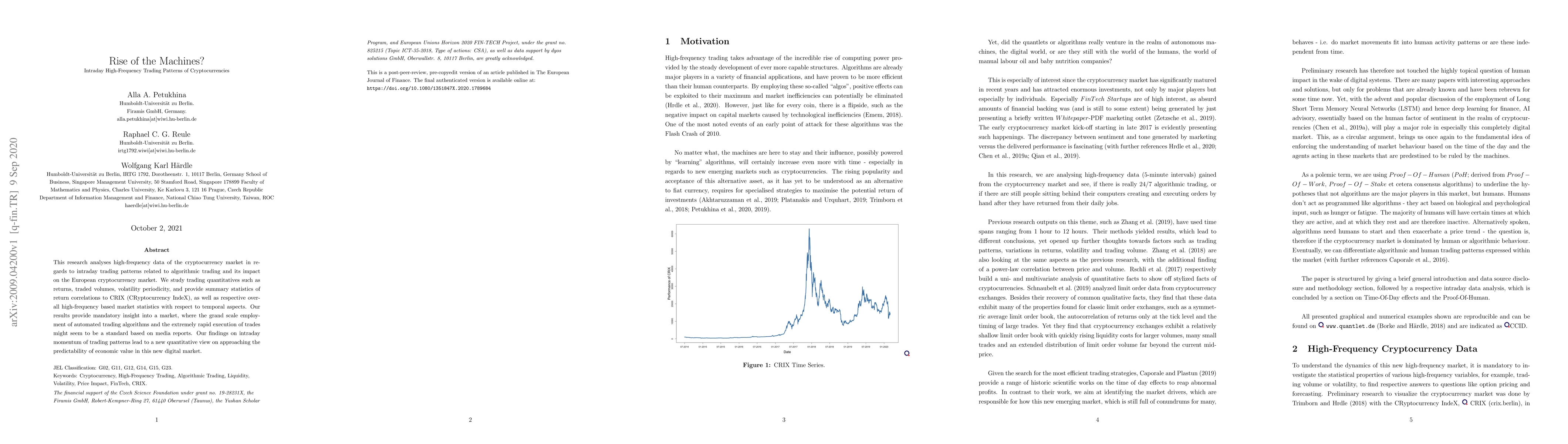 This research analyses high-frequency data of the cryptocurrency market in regards to intraday trading patterns related to algorithmic trading and its impact on the European cryptocurrency market. We study trading quantitatives such as returns, traded volumes, volatility periodicity, and provide summary statistics of return correlations to CRIX (CRyptocurrency IndeX), as well as respective overall high-frequency based market statistics with respect to temporal aspects. Our results provide mandatory insight into a market, where the grand scale employment of automated trading algorithms and the extremely rapid execution of trades might seem to be a standard based on media reports. Our findings on intraday momentum of trading patterns lead to a new quantitative view on approaching the predictability of economic value in this new digital market.