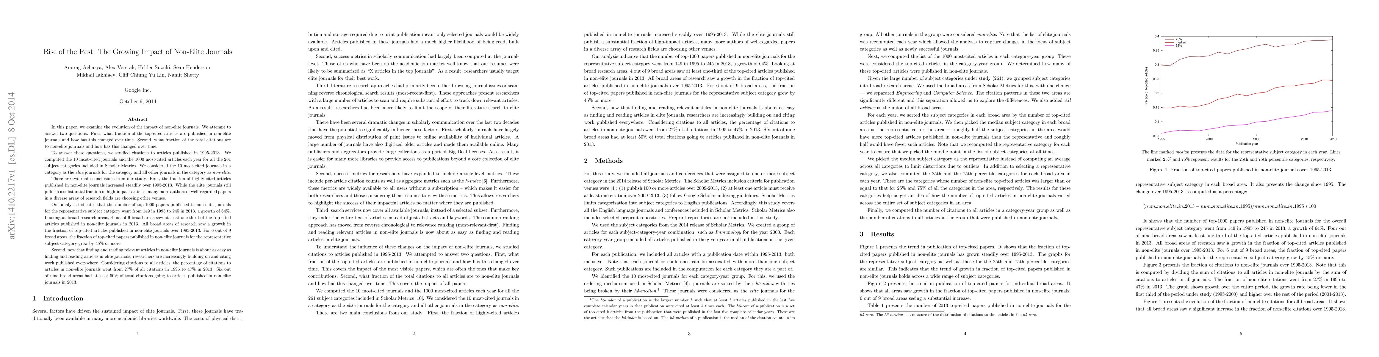 This paper investigates the increasing influence of non-elite journals, finding that the fraction of top-cited articles in these journals has grown steadily from 1995 to 2013. Additionally, the proportion of citations to non-elite journals has risen from 27% to 47% over the same period, indicating a broader reliance on diverse research venues.