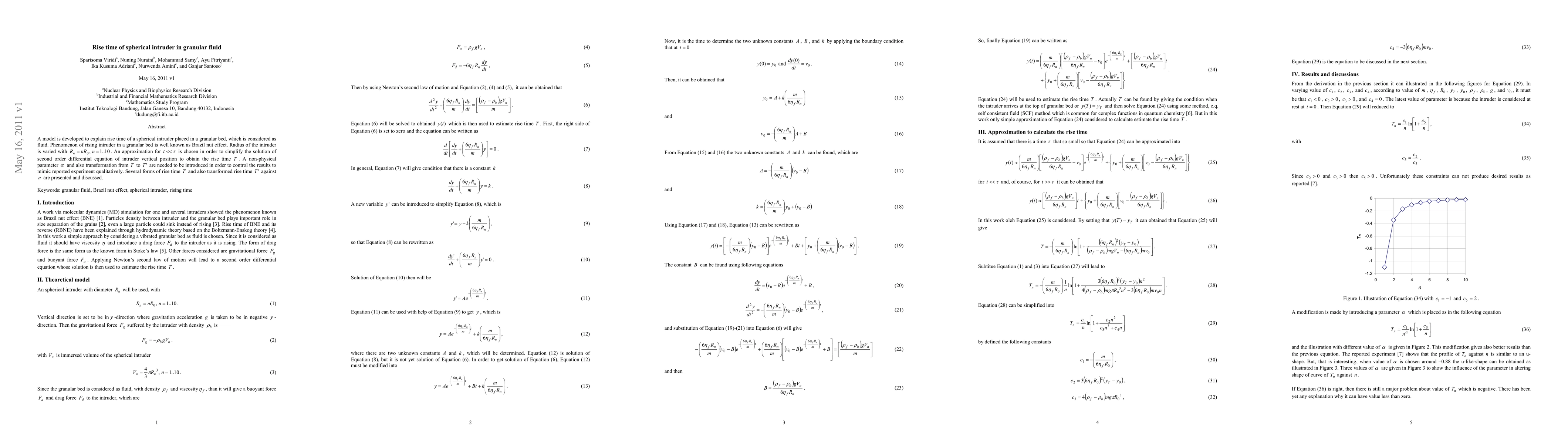 This paper develops a model to explain the rise time of spherical intruders in granular fluid, known as the Brazil nut effect, where the intruder's radius varies. The study simplifies the differential equation for intruder vertical motion and introduces a non-physical parameter to qualitatively match experimental results, presenting various forms of rise time against intruder size.