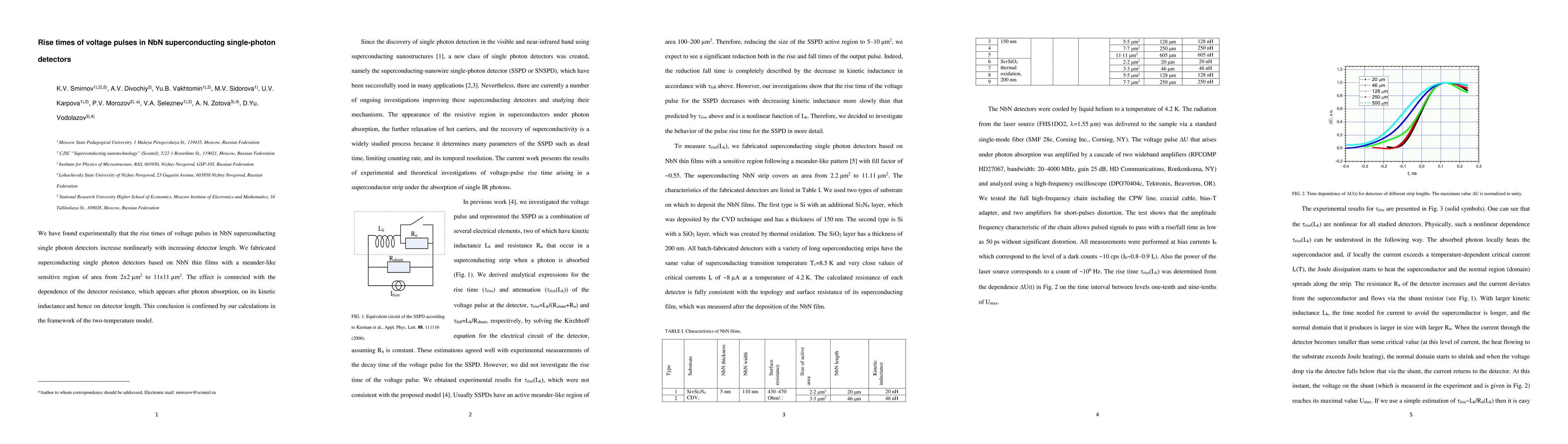 We have found experimentally that the rise times of voltage pulses in NbN superconducting single photon detectors increase nonlinearly with increasing detector length. We fabricated superconducting single photon detectors based on NbN thin films with a meander-like sensitive region of area from 2x2um2 to 11x11um2. The effect is connected with the dependence of the detector resistance, which appears after photon absorption, on its kinetic inductance and hence on detector length. This conclusion is confirmed by our calculations in the framework of the two-temperature model.