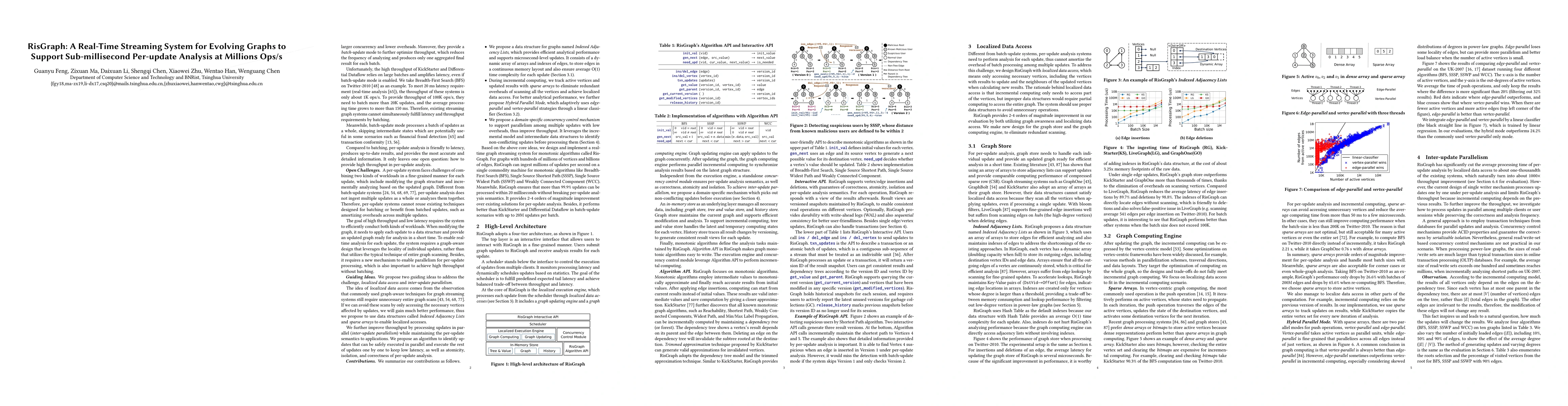 RisGraph is a real-time streaming system designed for high-throughput, low-latency analysis of evolving graphs, achieving millions of updates per second. It employs localized data access and inter-update parallelism, including an Indexed Adjacency Lists data structure and a domain-specific concurrency control mechanism, to meet the demands of real-time applications like financial fraud detection.